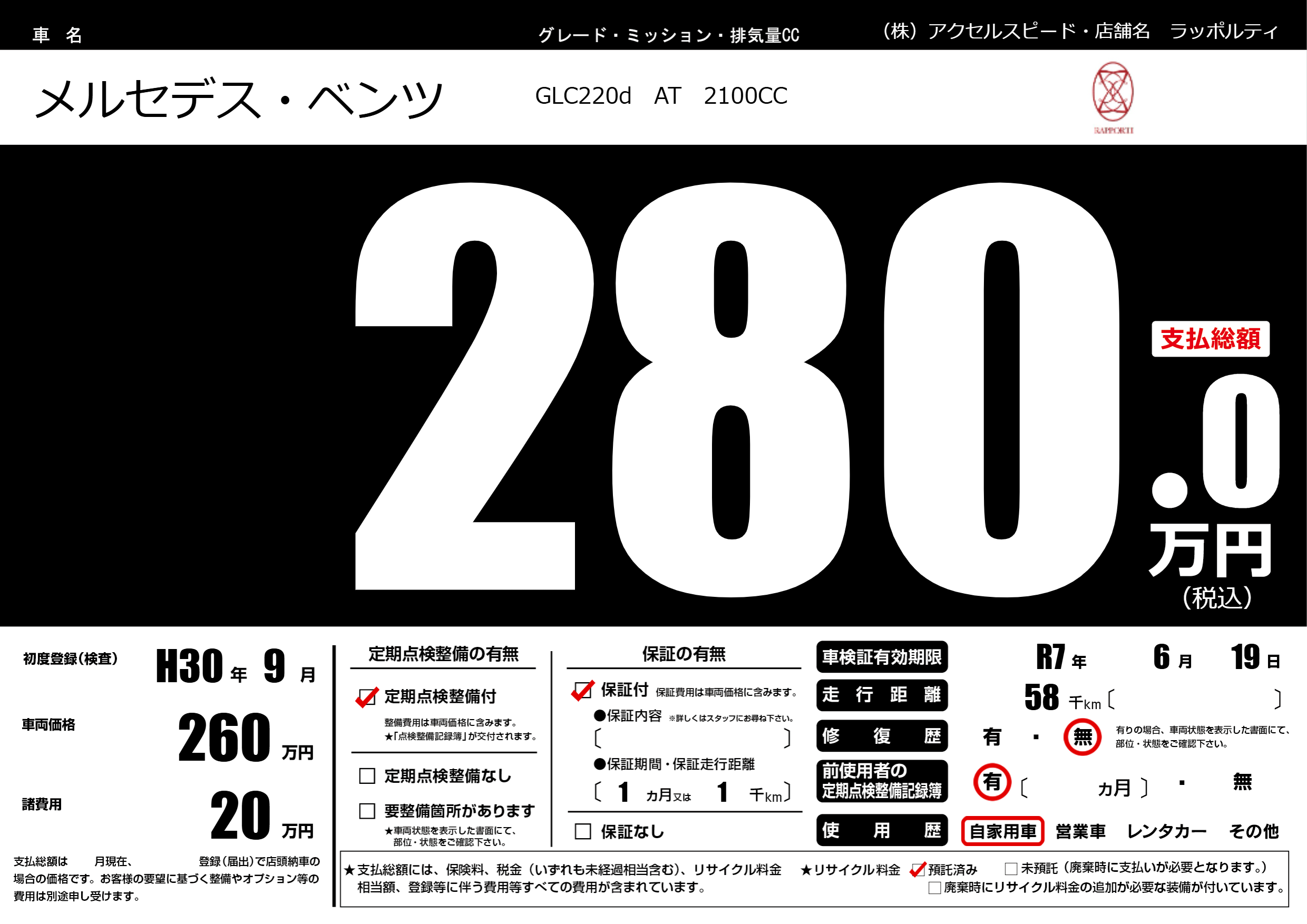 | 車名 | メルセデス・ベンツ | グレード ミッション 排気量 |