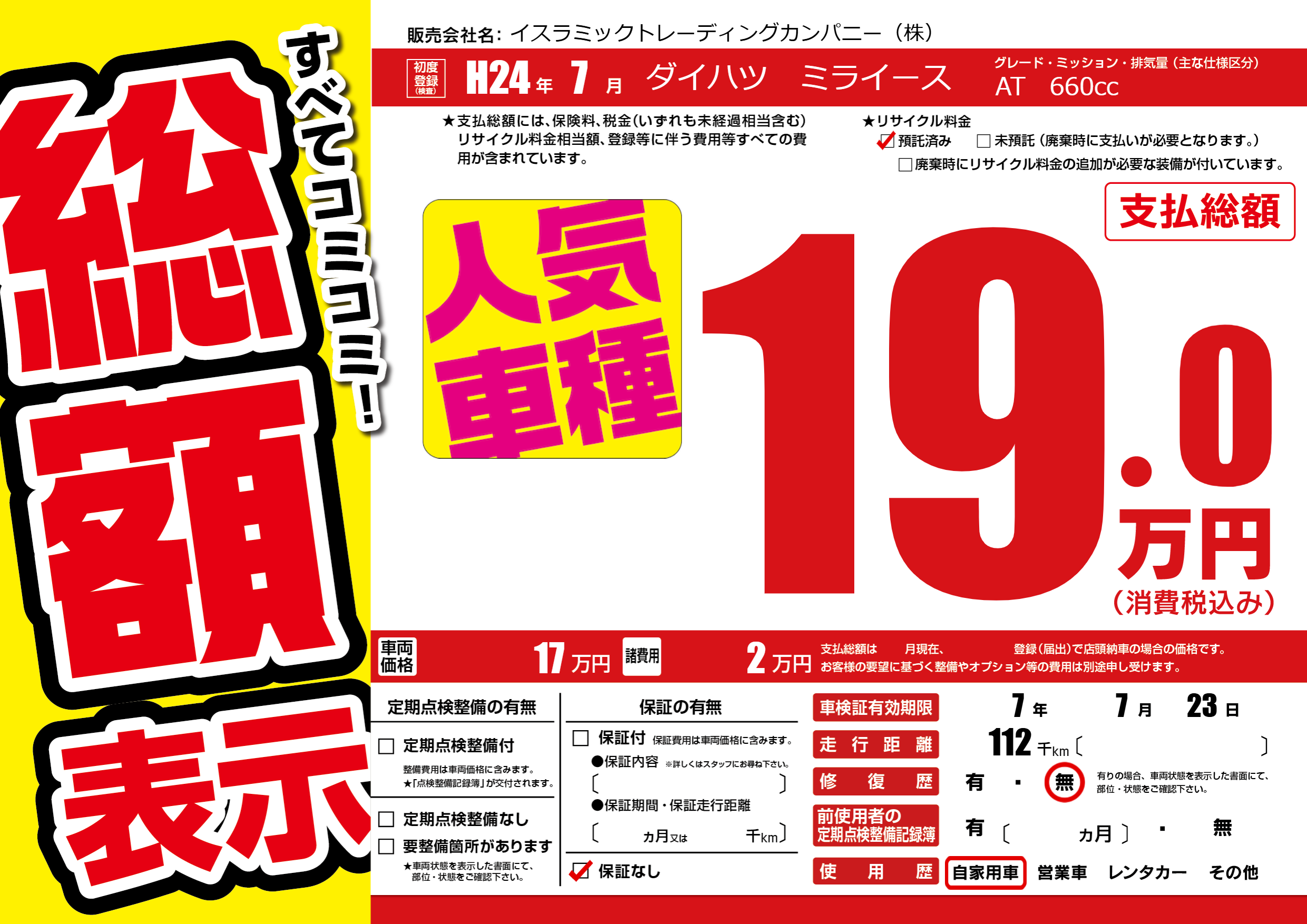 | 走行キロ | 11.2万km | 初年度登録 | H24年7月 |