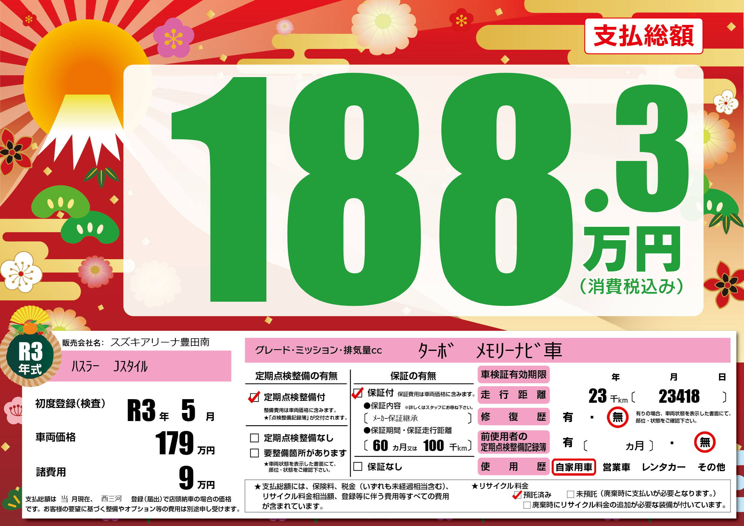 | 走行キロ | 2.3万km | 初年度登録 | R3年5月 |