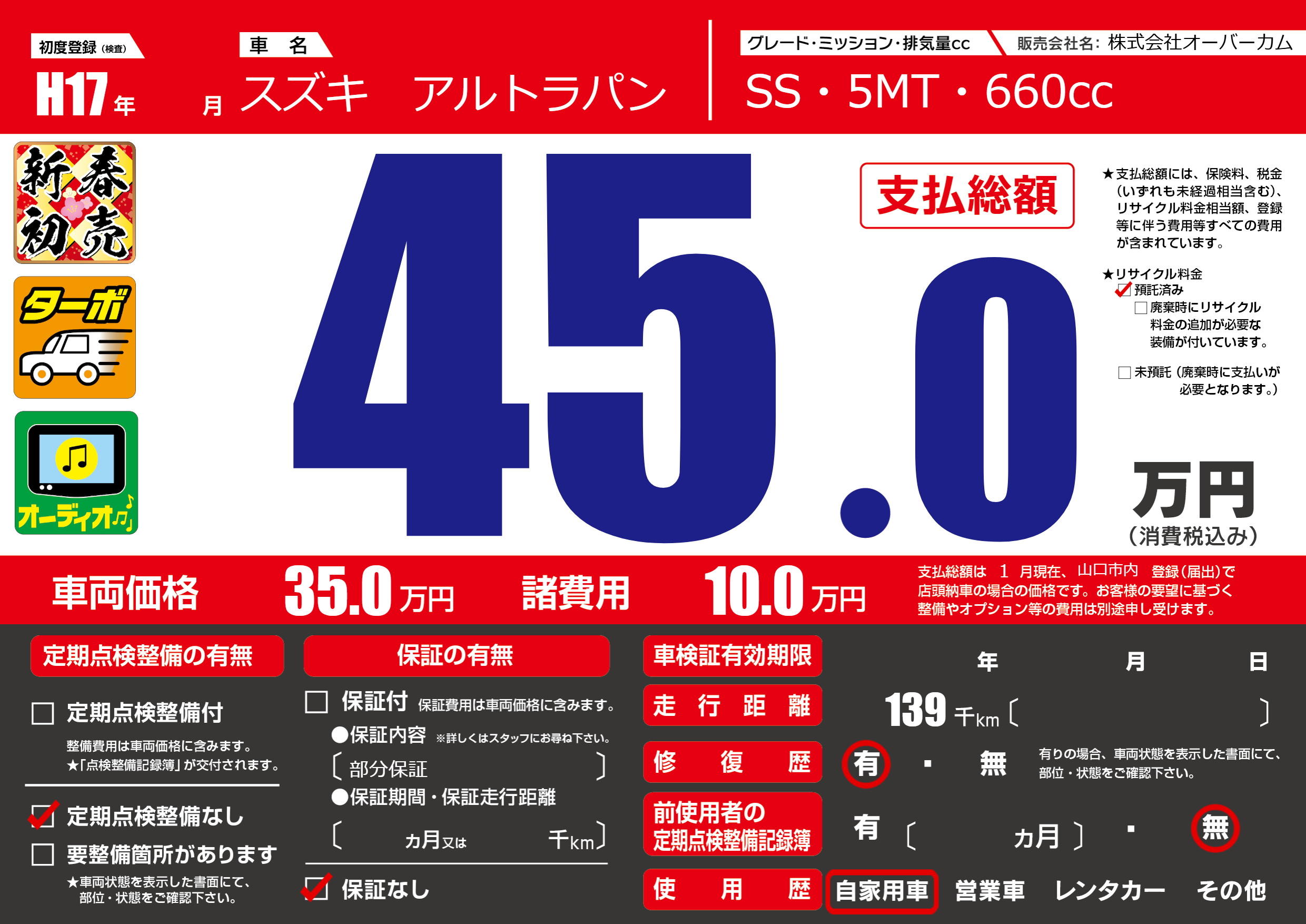 保証なし 保証内容(部分保証) ---ヶ月または()千kmまで |