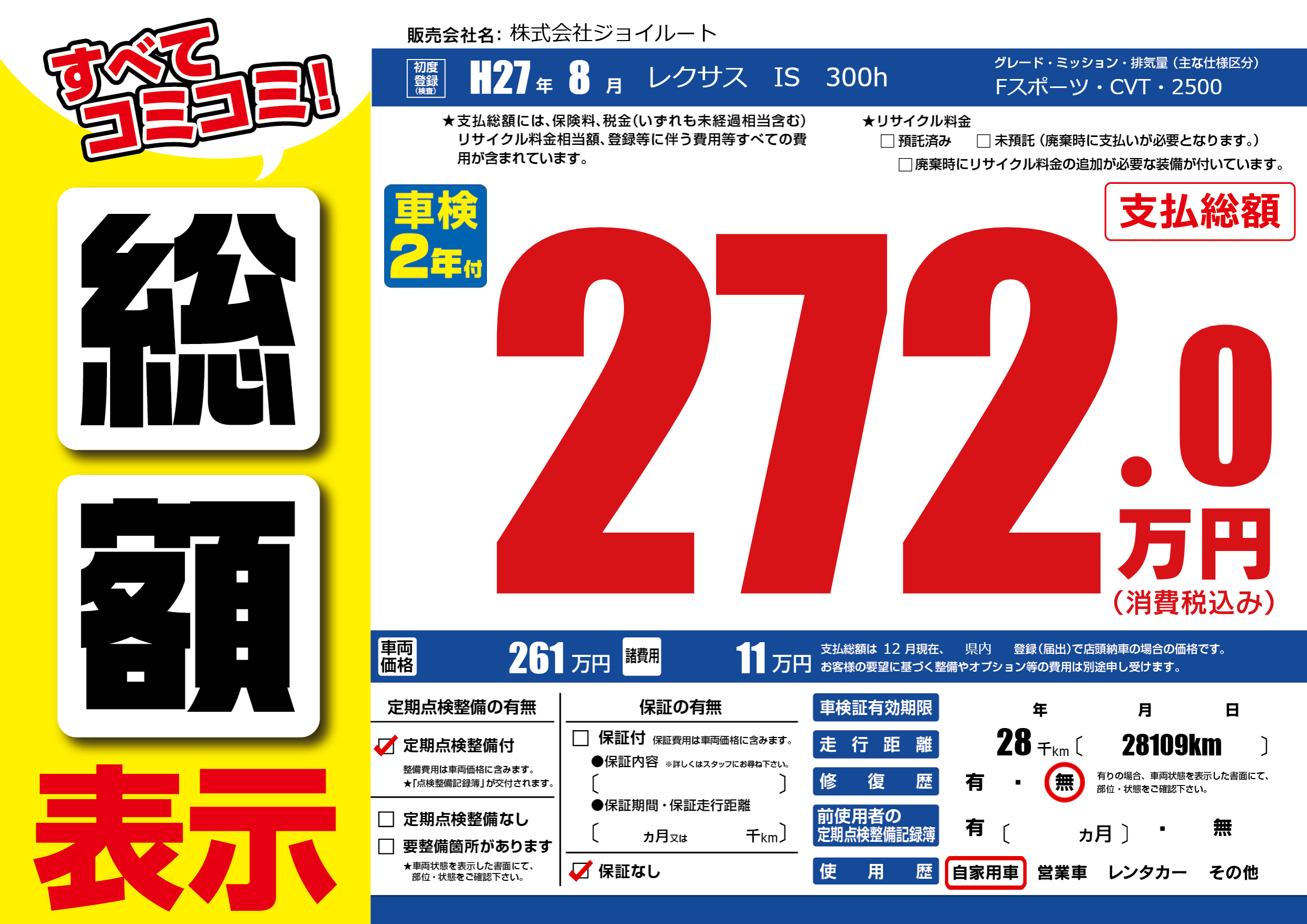 | 車名 | レクサス IS 300h | グレード ミッション 排気量 |
