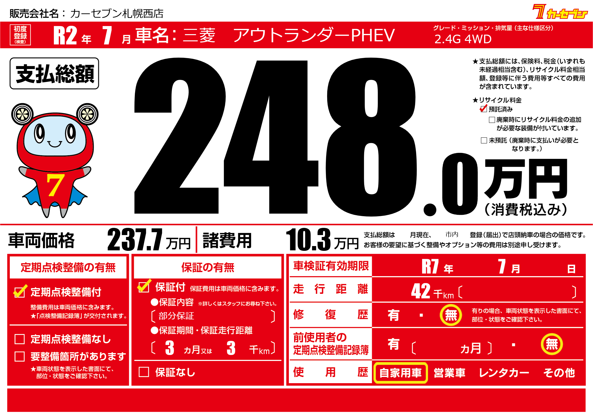 | 車名 | 三菱 アウトランダーPHEV | グレード ミッション 排気量 |