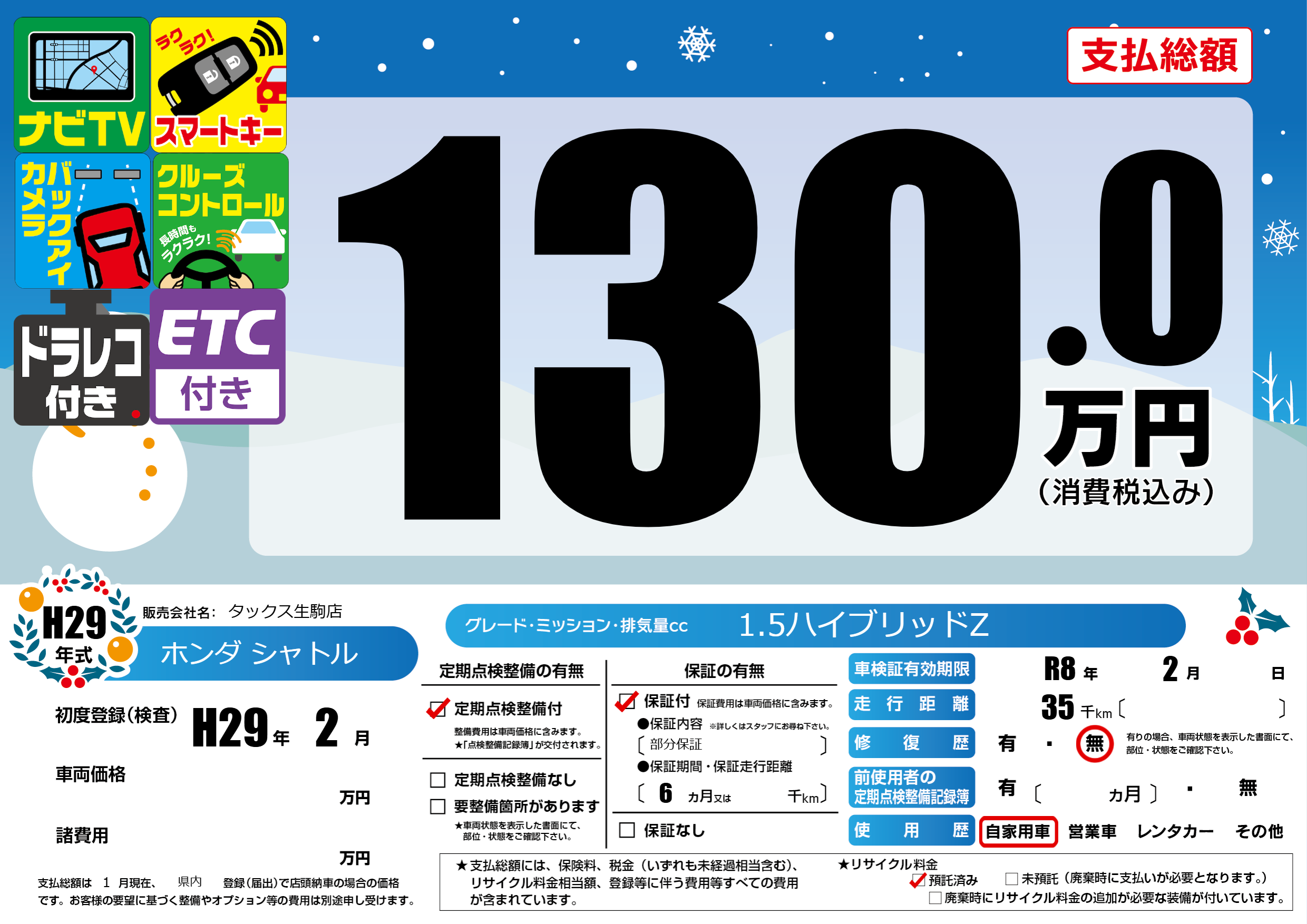 | 走行キロ | 3.5万km | 初年度登録 | H29年2月 |