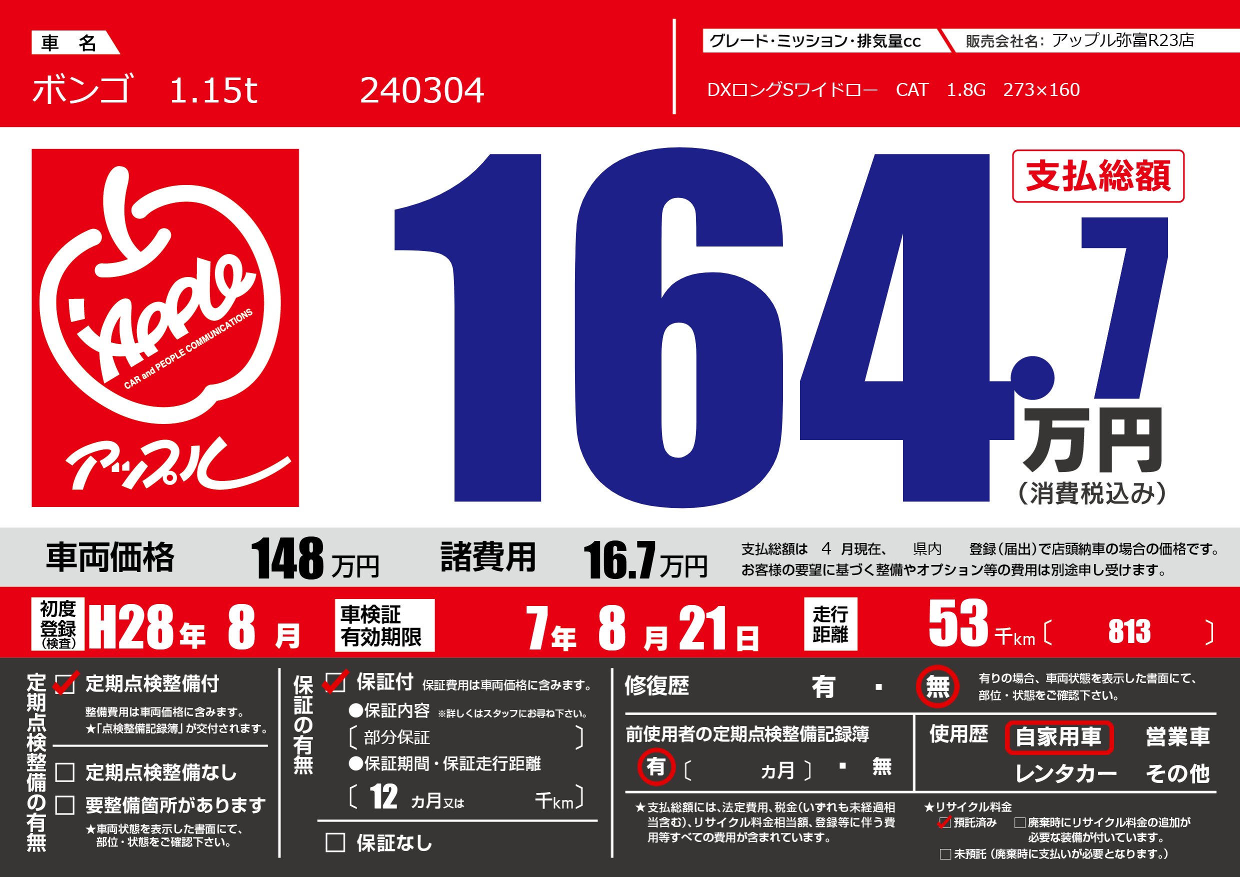 | 車名 | ボンゴ 1.15t 240304 | グレード ミッション 排気量 |