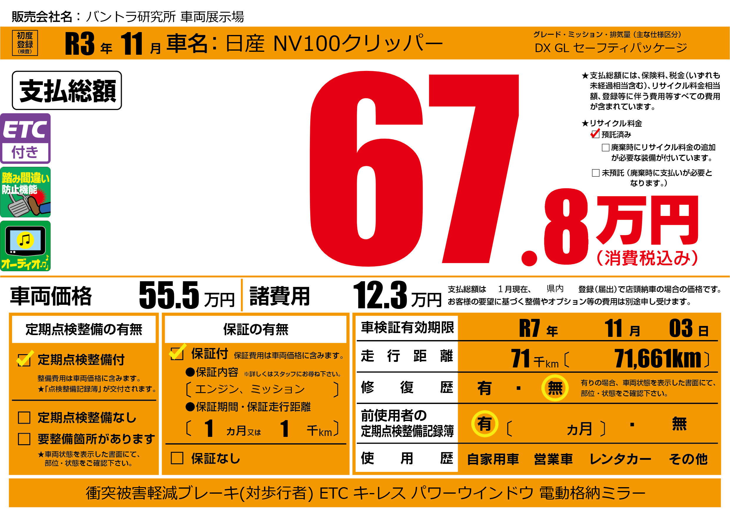 | 車名 | 日産 NV100クリッパー | グレード ミッション 排気量 |