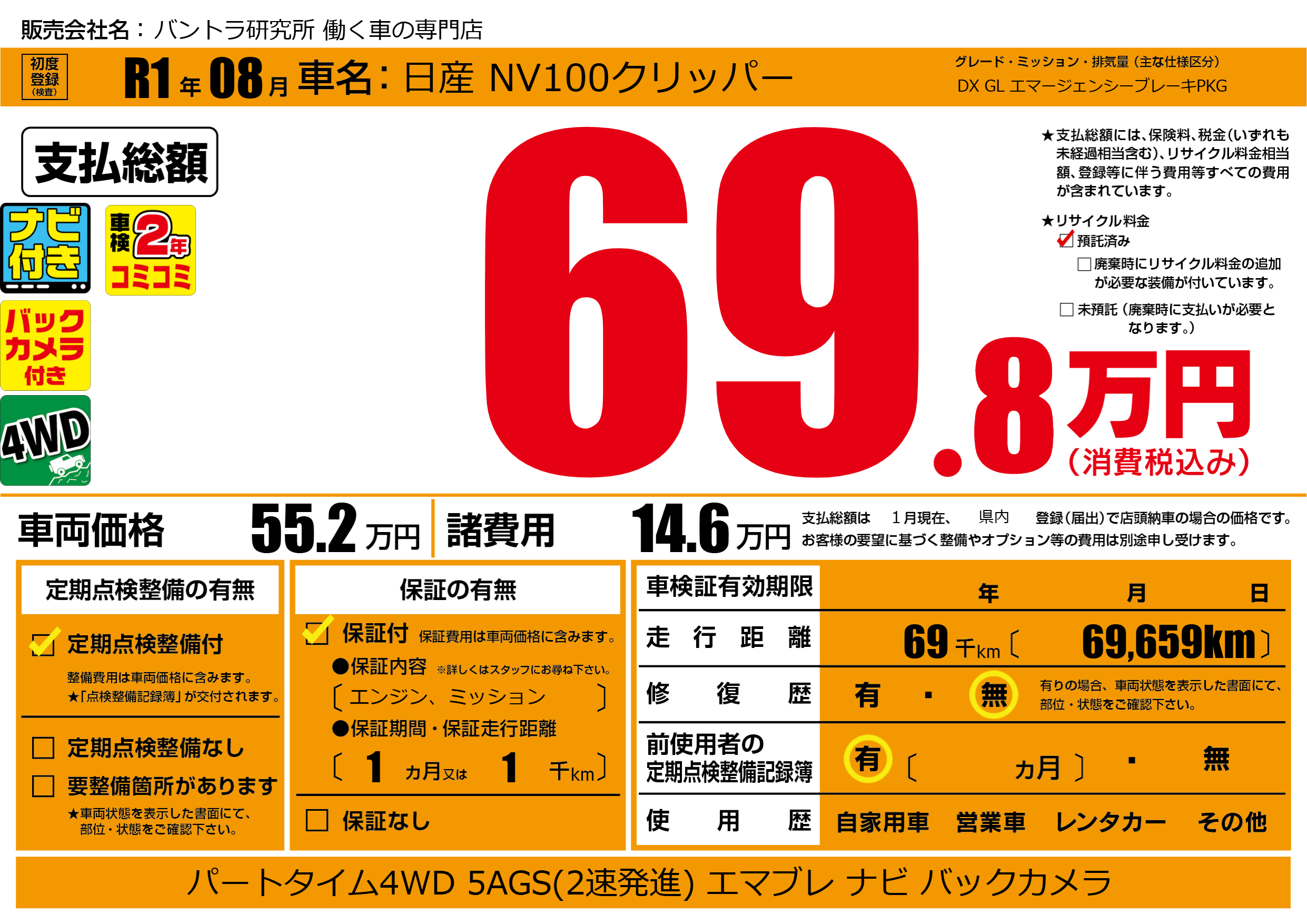 | 車名 | 日産 NV100クリッパー | グレード ミッション 排気量 |