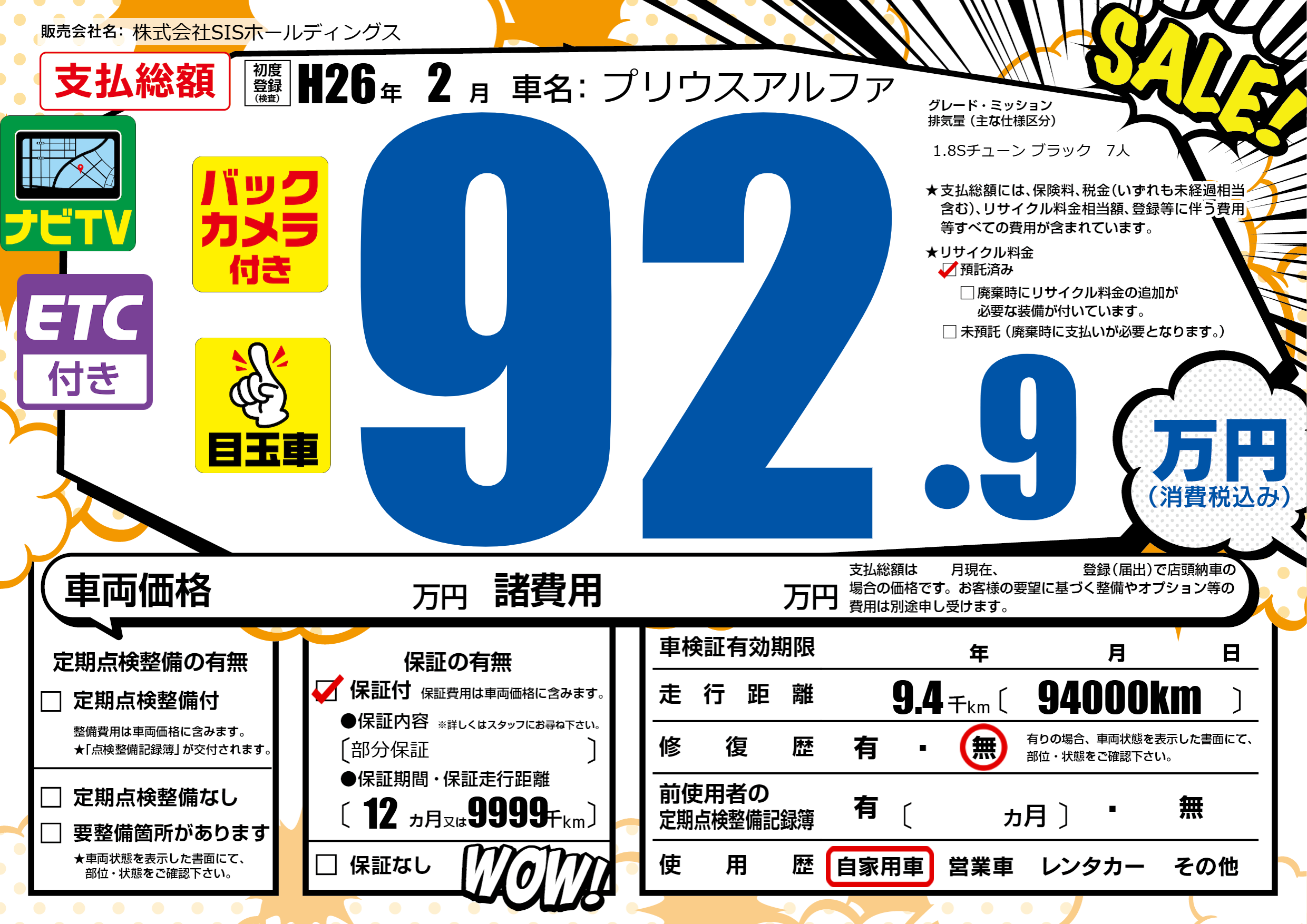 保証付き 保証内容(部分保証) 12ヶ月または(9999)千kmまで |