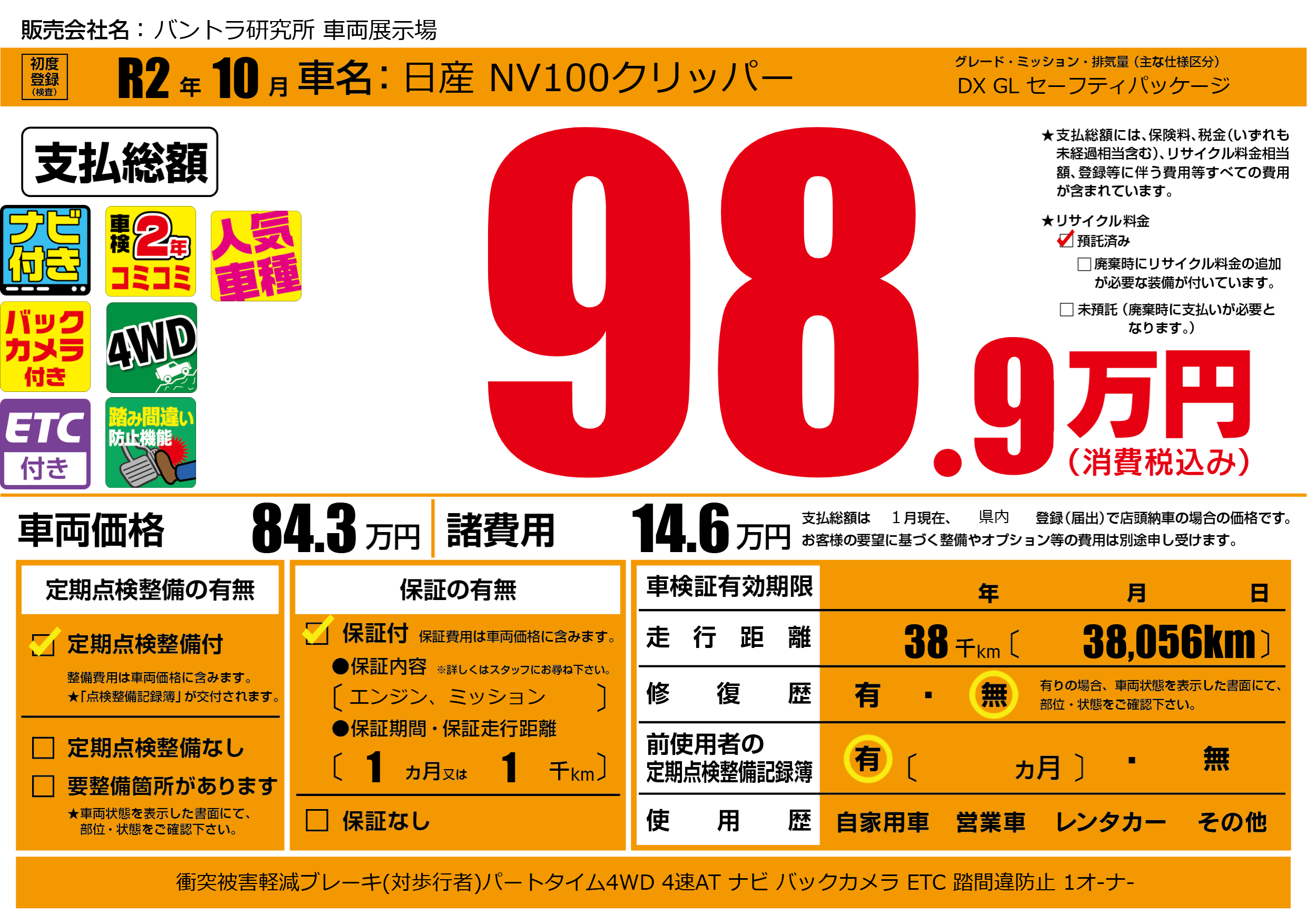 | 車名 | 日産 NV100クリッパー | グレード ミッション 排気量 |