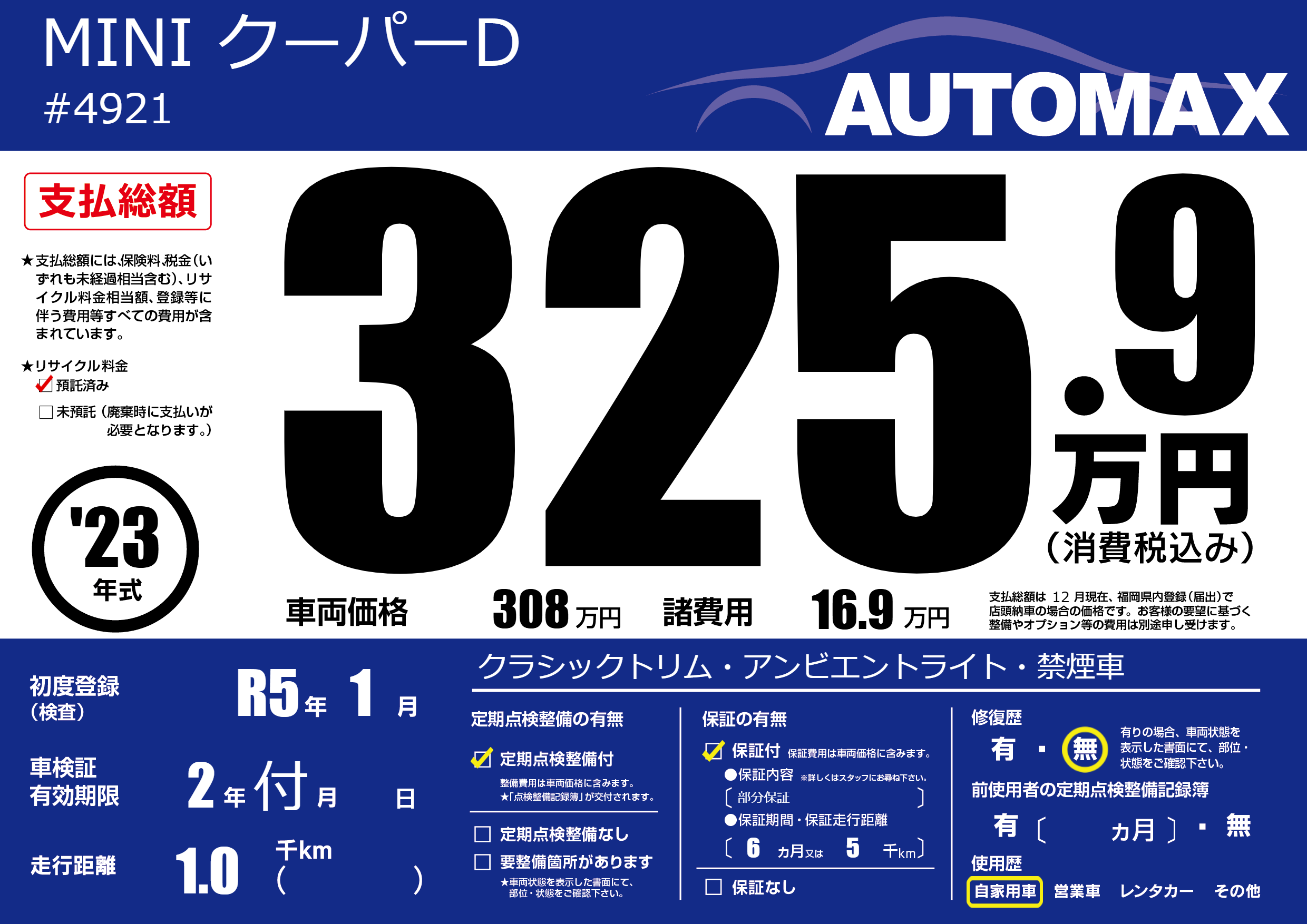 | 車名 | MINI クーパーD | グレード ミッション 排気量 |