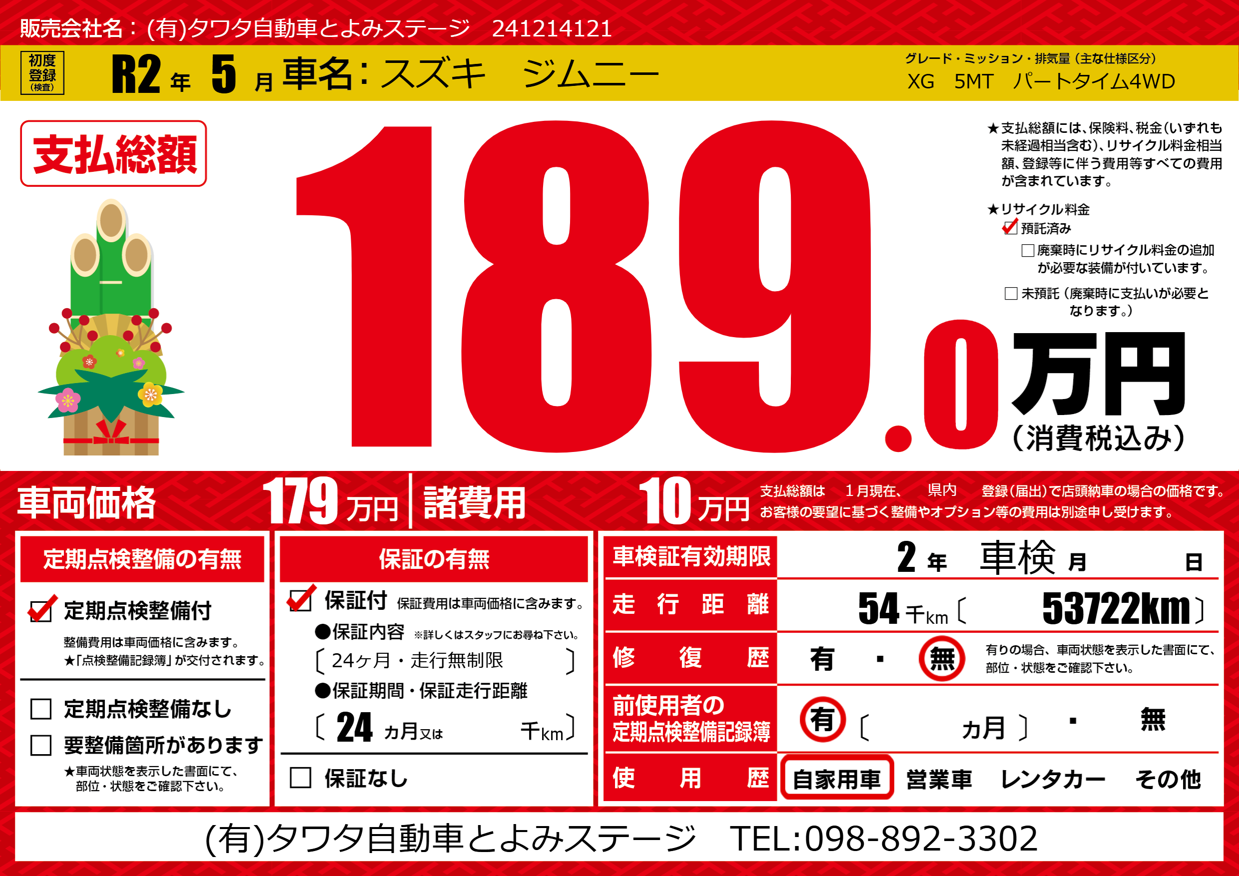 | 車名 | スズキ ジムニー | グレード ミッション 排気量 |