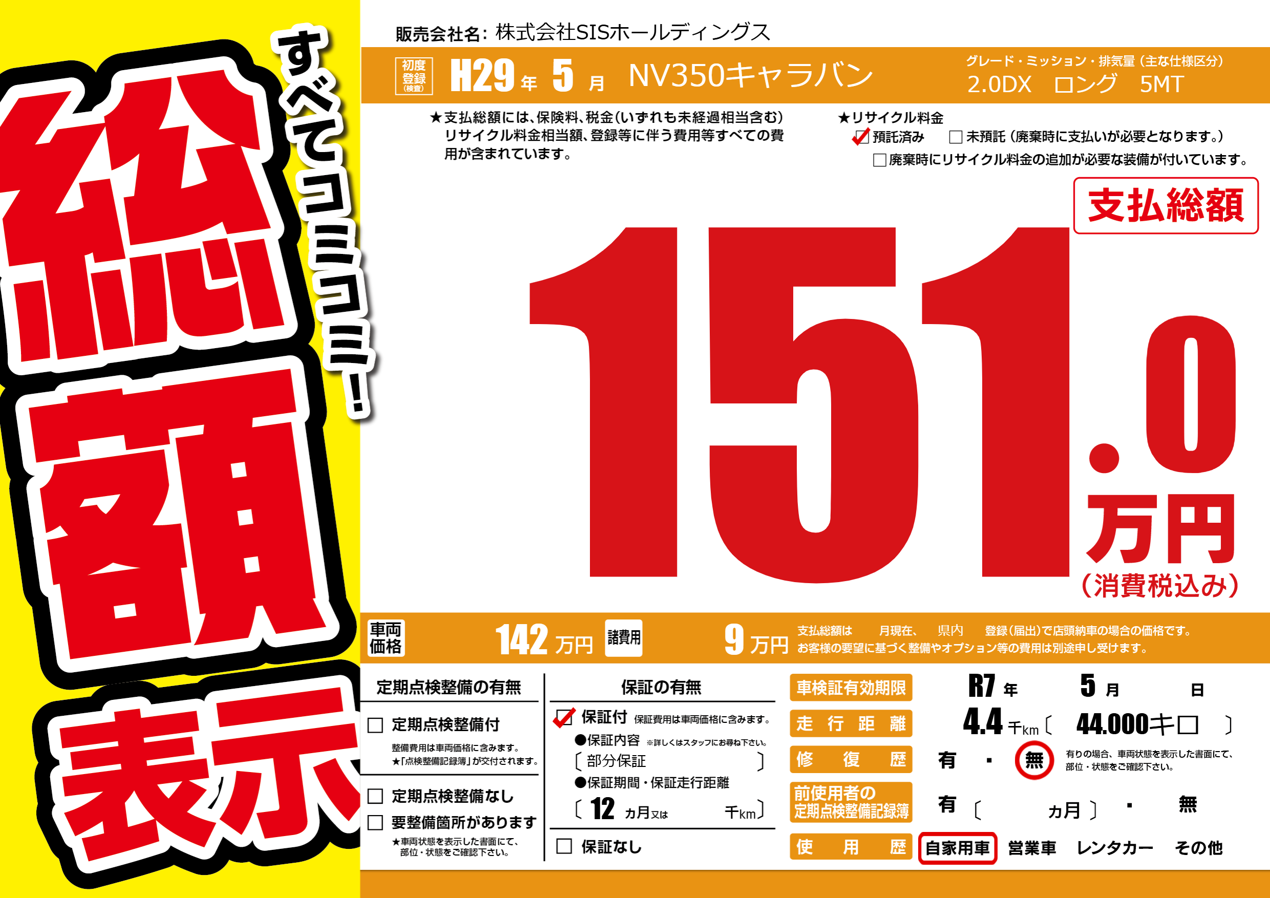 | 車名 | NV350キャラバン | グレード ミッション 排気量 |