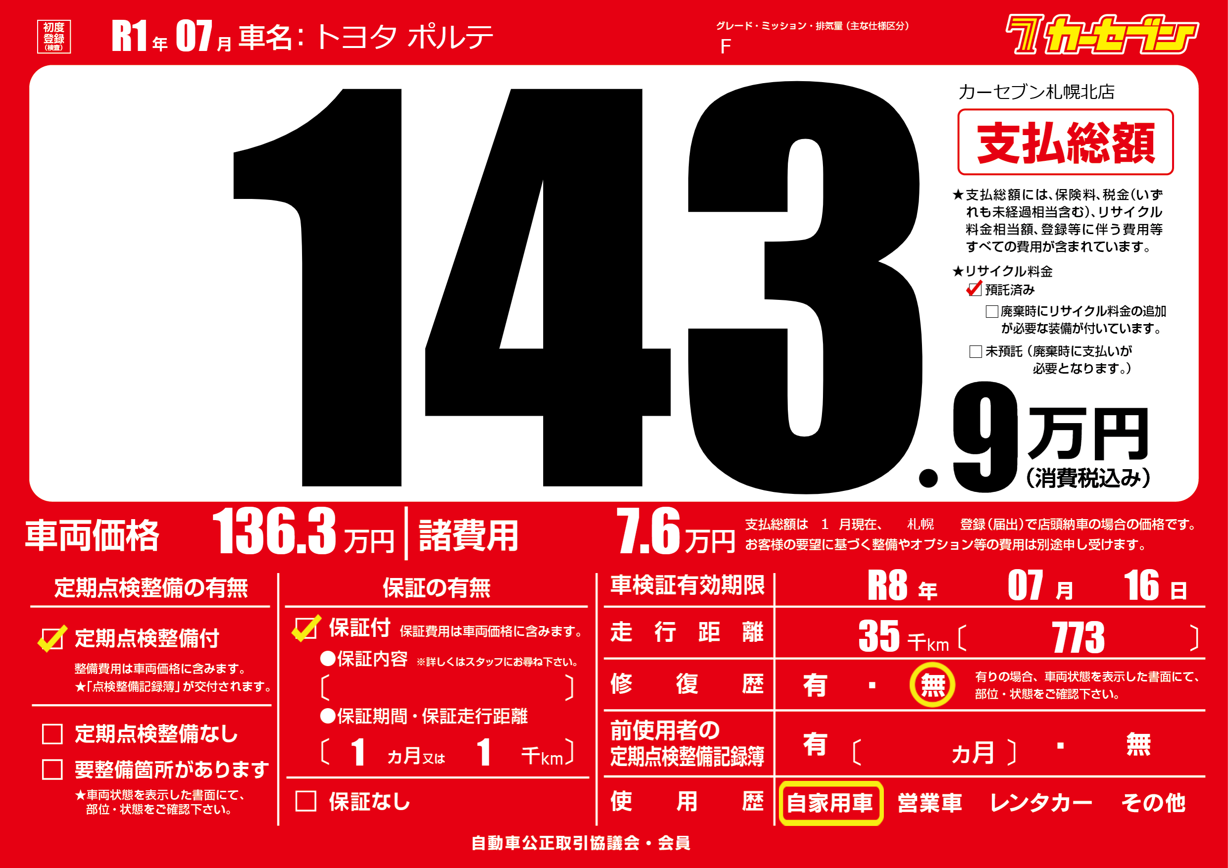 | 走行キロ | 3.5万km | 初年度登録 | R1年07月 |
