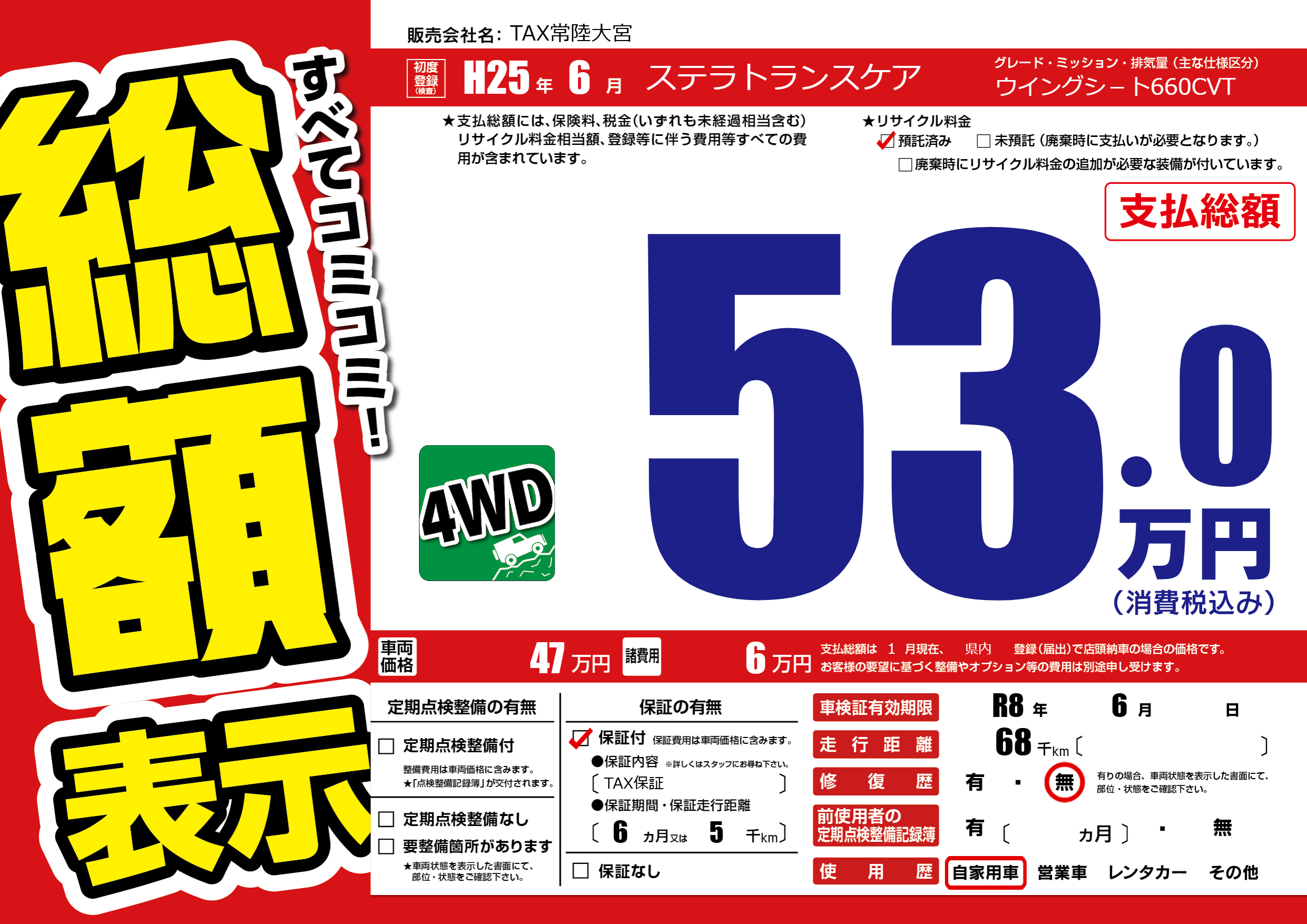 保証付き 保証内容(TAX保証) 6ヶ月または(5)千kmまで |
