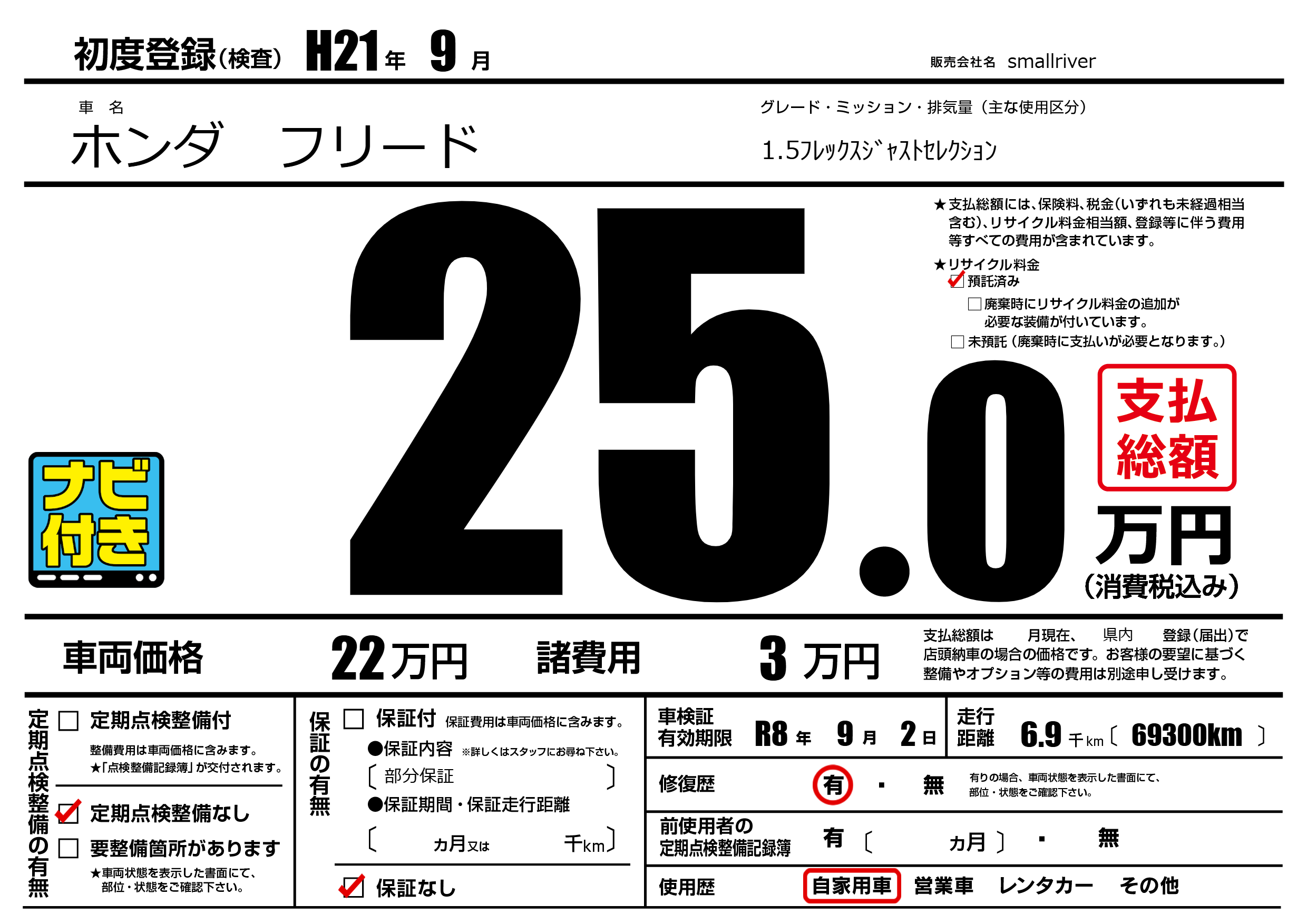 | 車名 | ホンダ フリード | グレード ミッション 排気量 |