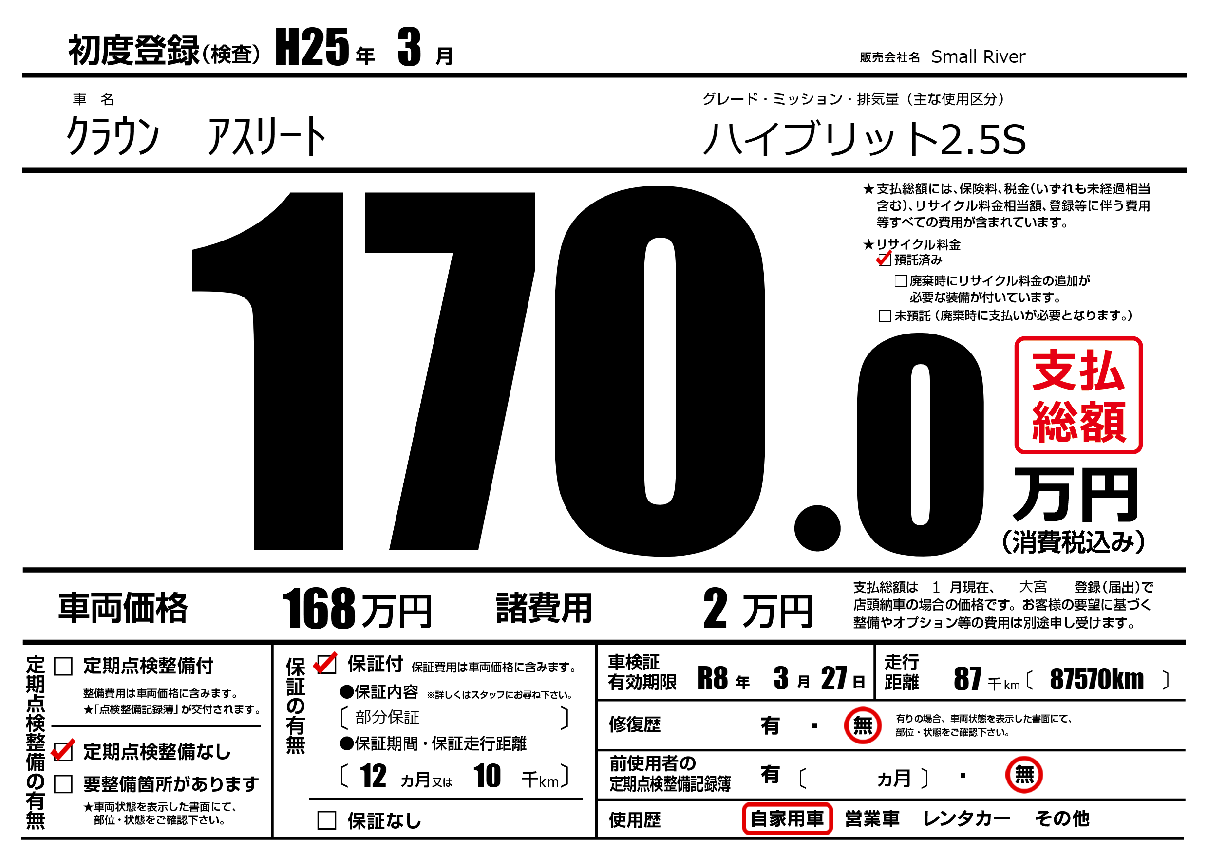 | 車名 | クラウン アスリート | グレード ミッション 排気量 |