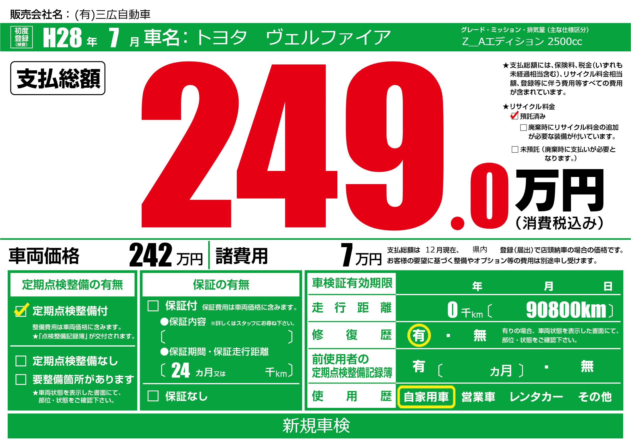 | 車名 | トヨタ ヴェルファイア | グレード ミッション 排気量 |