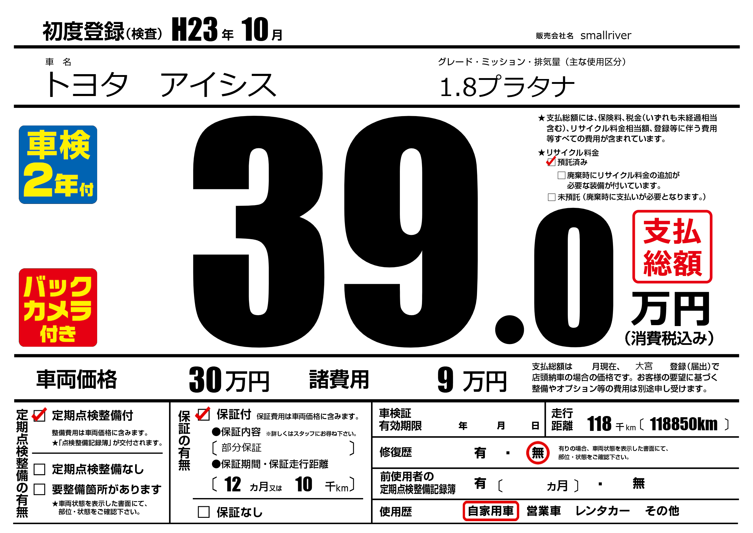 | 走行キロ | 11.8万km | 初年度登録 | H23年10月 |