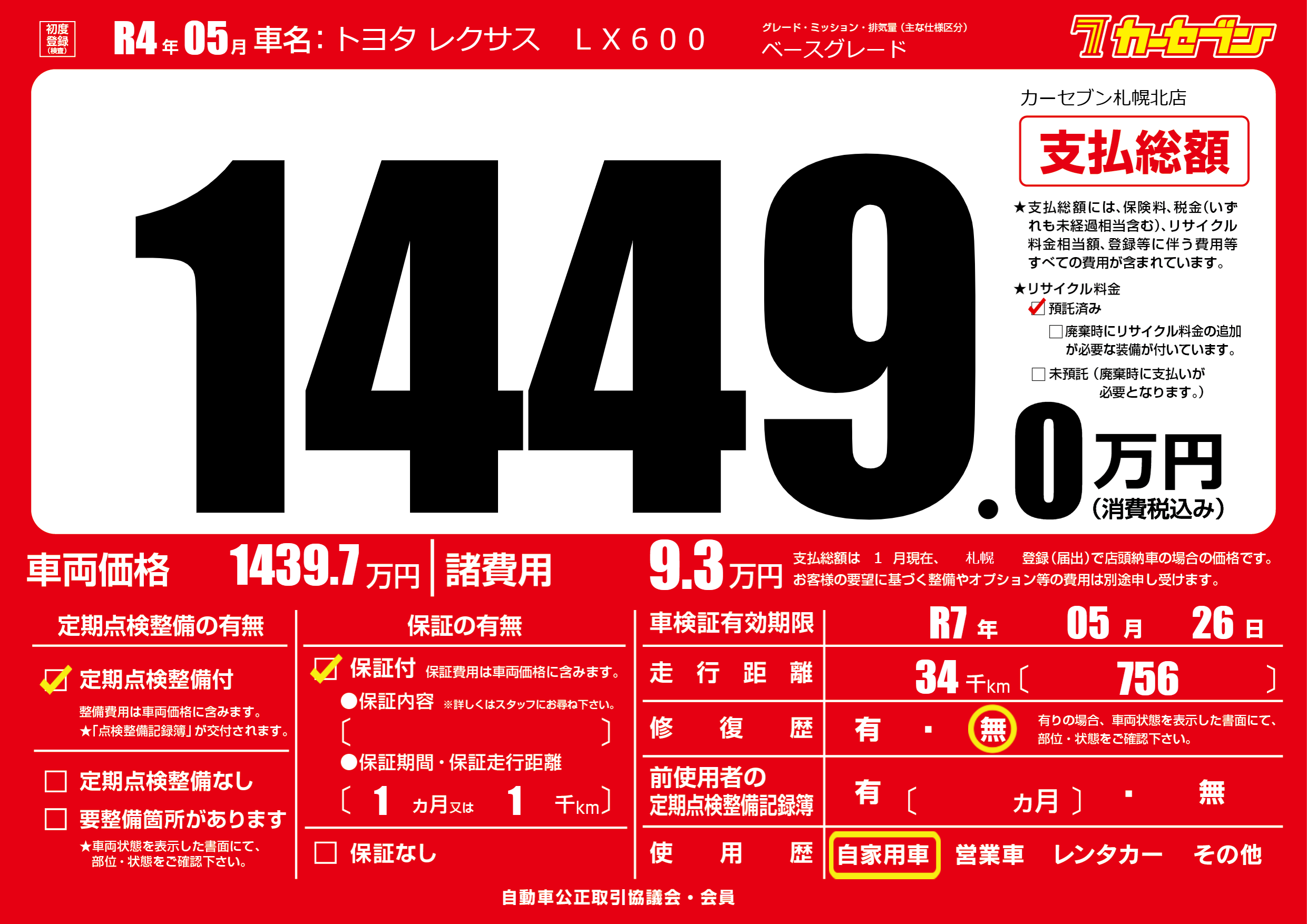 | 車名 | トヨタ レクサス LX600 | グレード ミッション 排気量 |