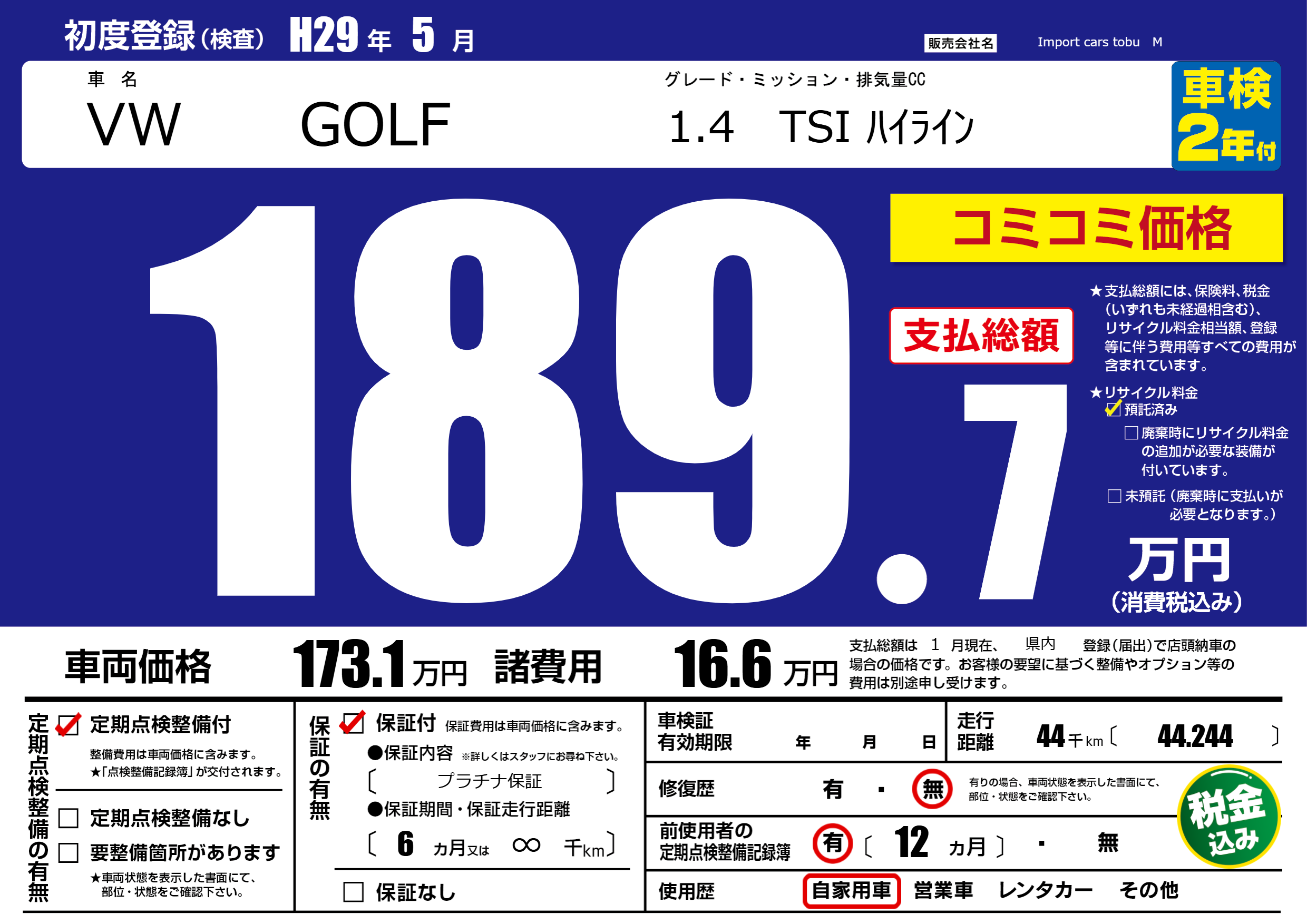 保証付き 保証内容( プラチナ保証) 6ヶ月または(∞)千kmまで |