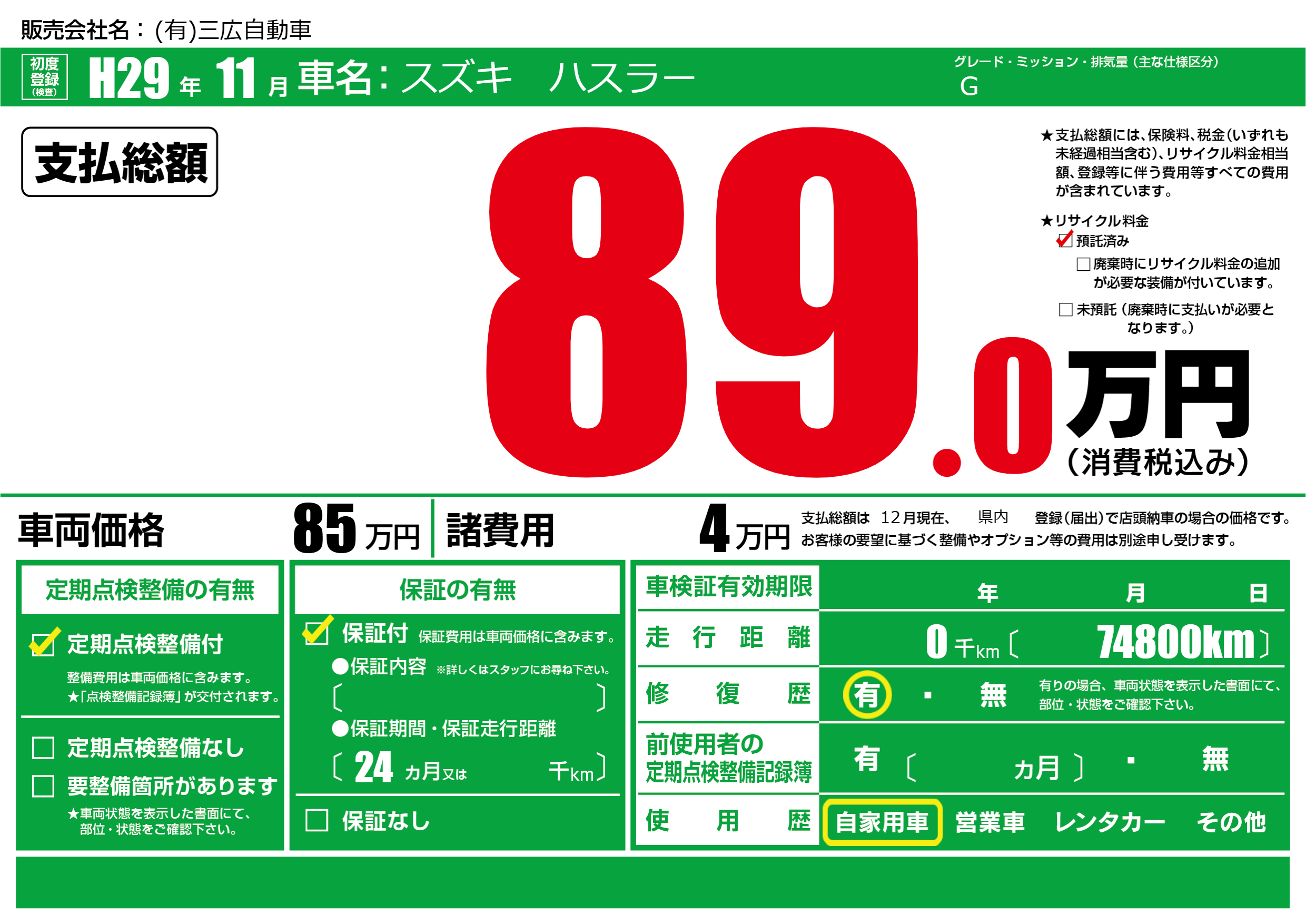 | 車名 | スズキ ハスラー | グレード ミッション 排気量 |