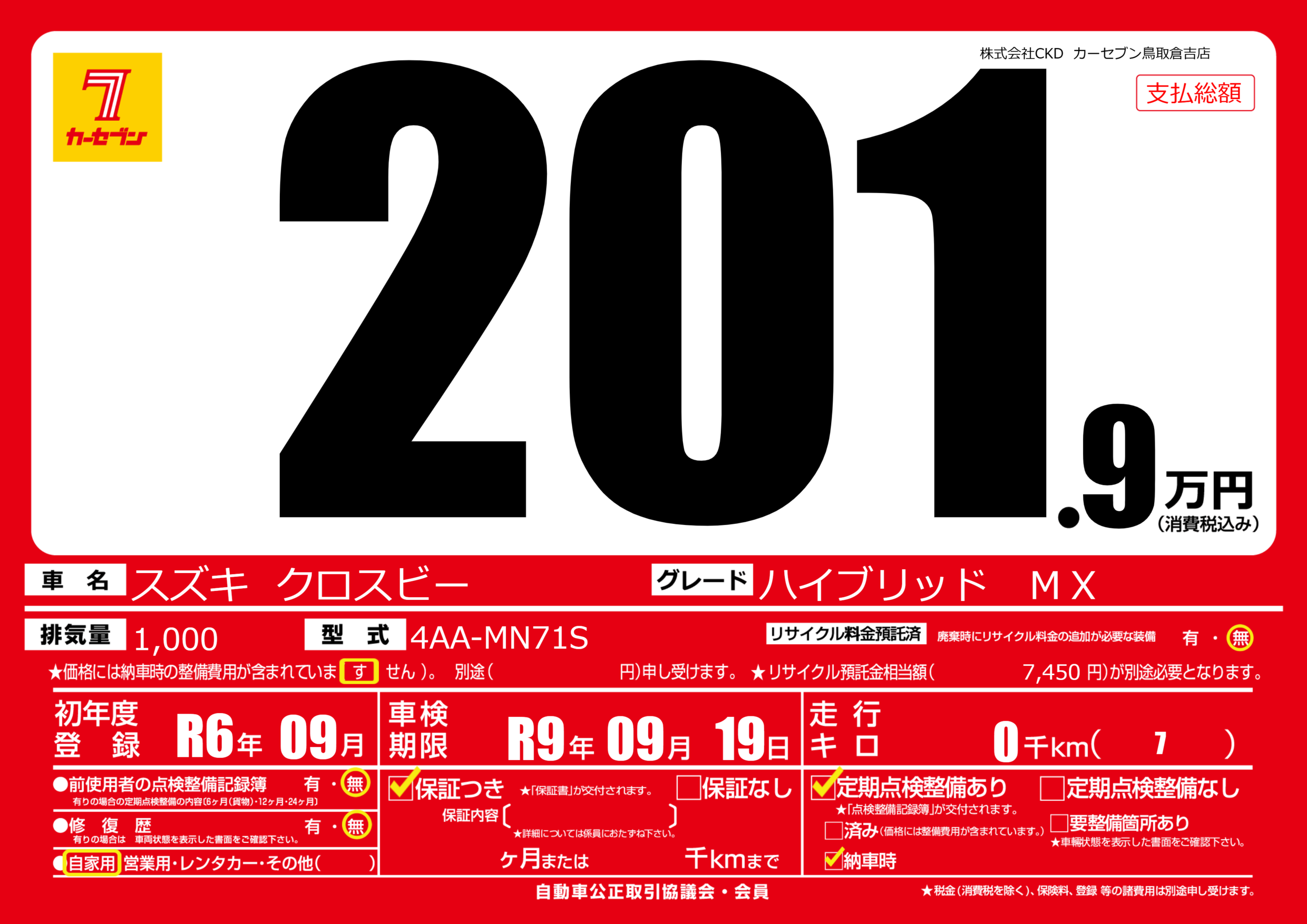| 車検制限 | R9年 09月 19日 | ||