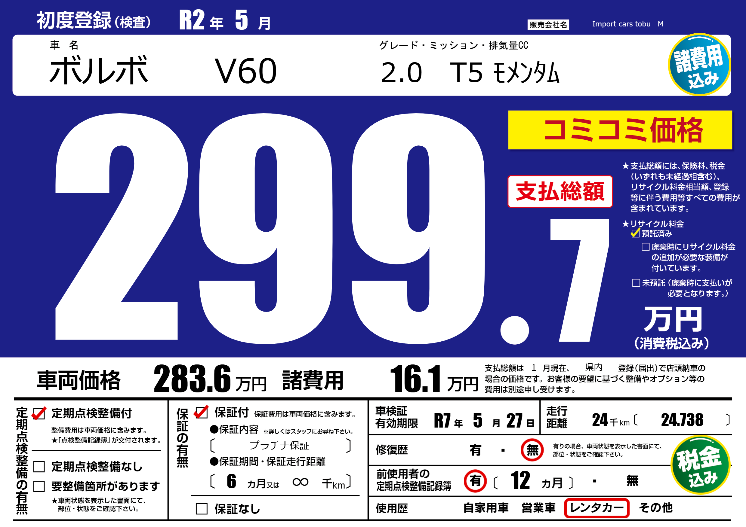 | 車名 | ボルボ V60 | グレード ミッション 排気量 |
