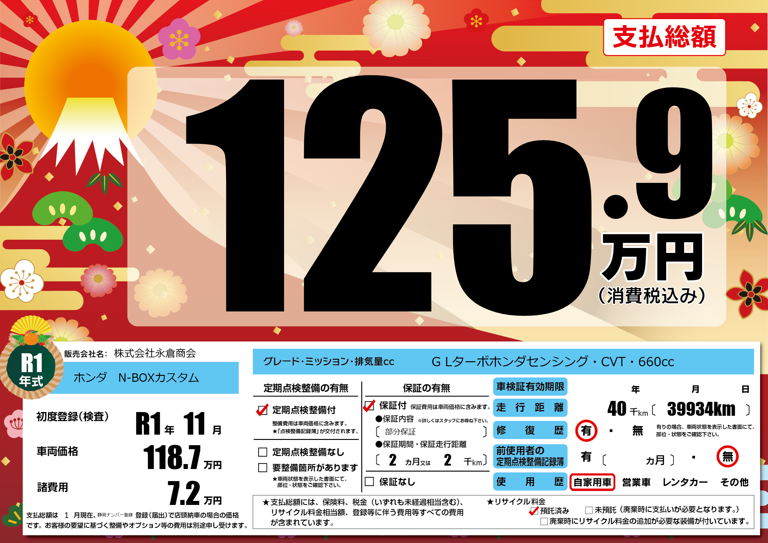 | 走行キロ | 4万km | 初年度登録 | R1年11月 |