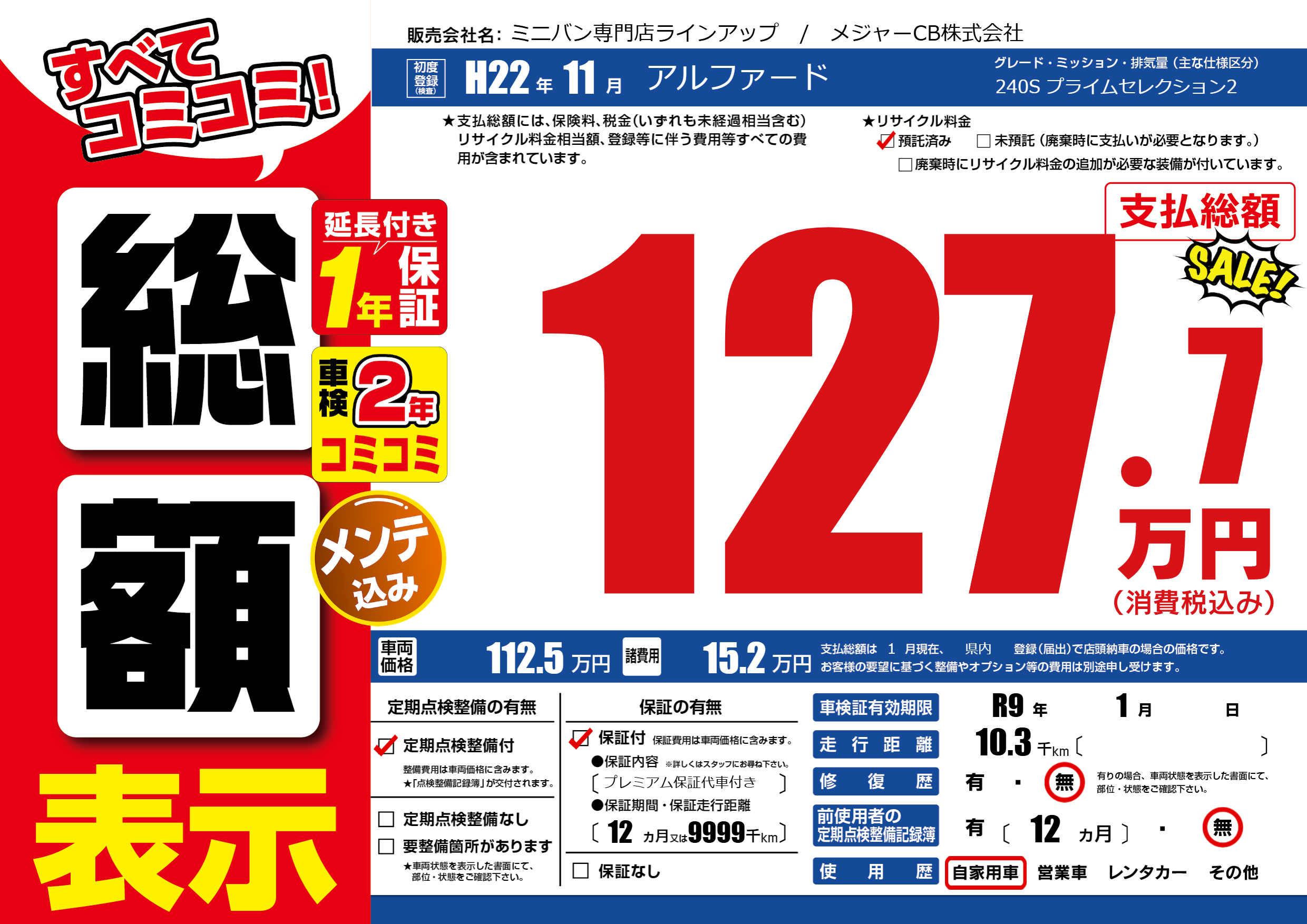 保証付き 保証内容(プレミアム保証代車付き) 12ヶ月または(9999)千kmまで |