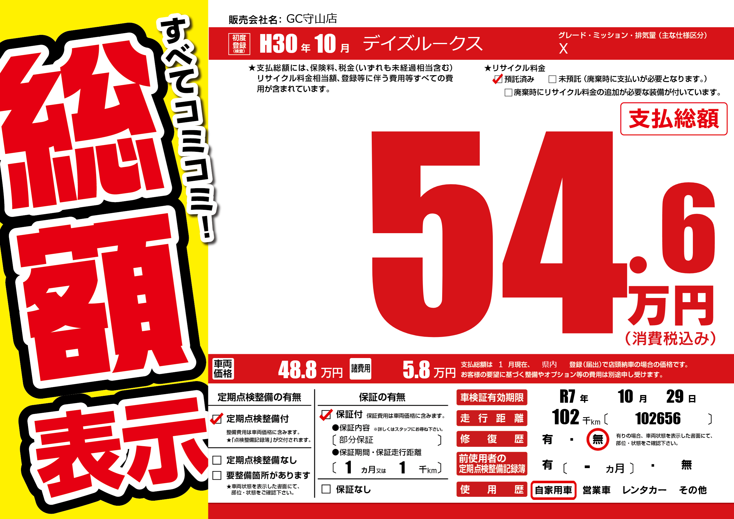| 走行キロ | 10.2万km | 初年度登録 | H30年10月 |