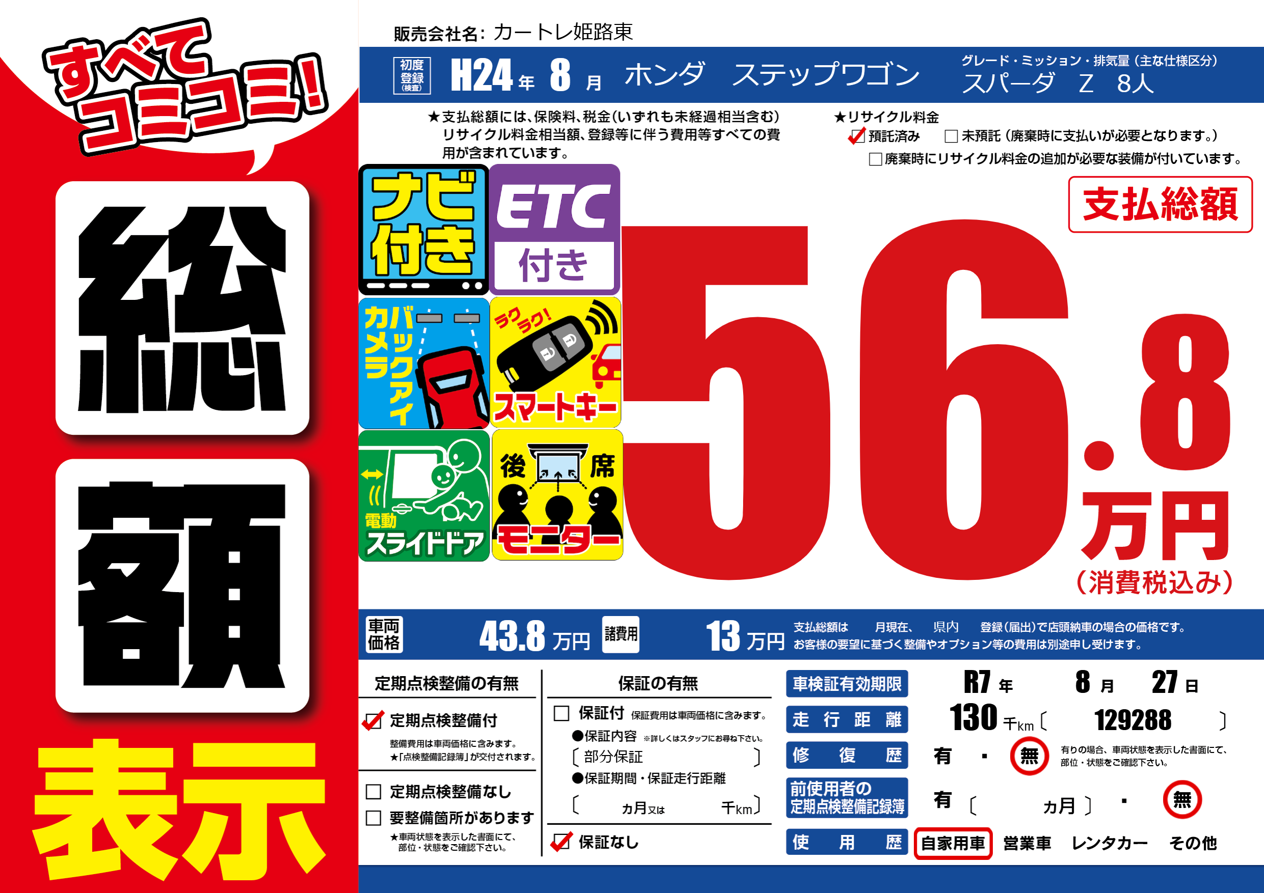 | 走行キロ | 13万km | 初年度登録 | H24年8月 |