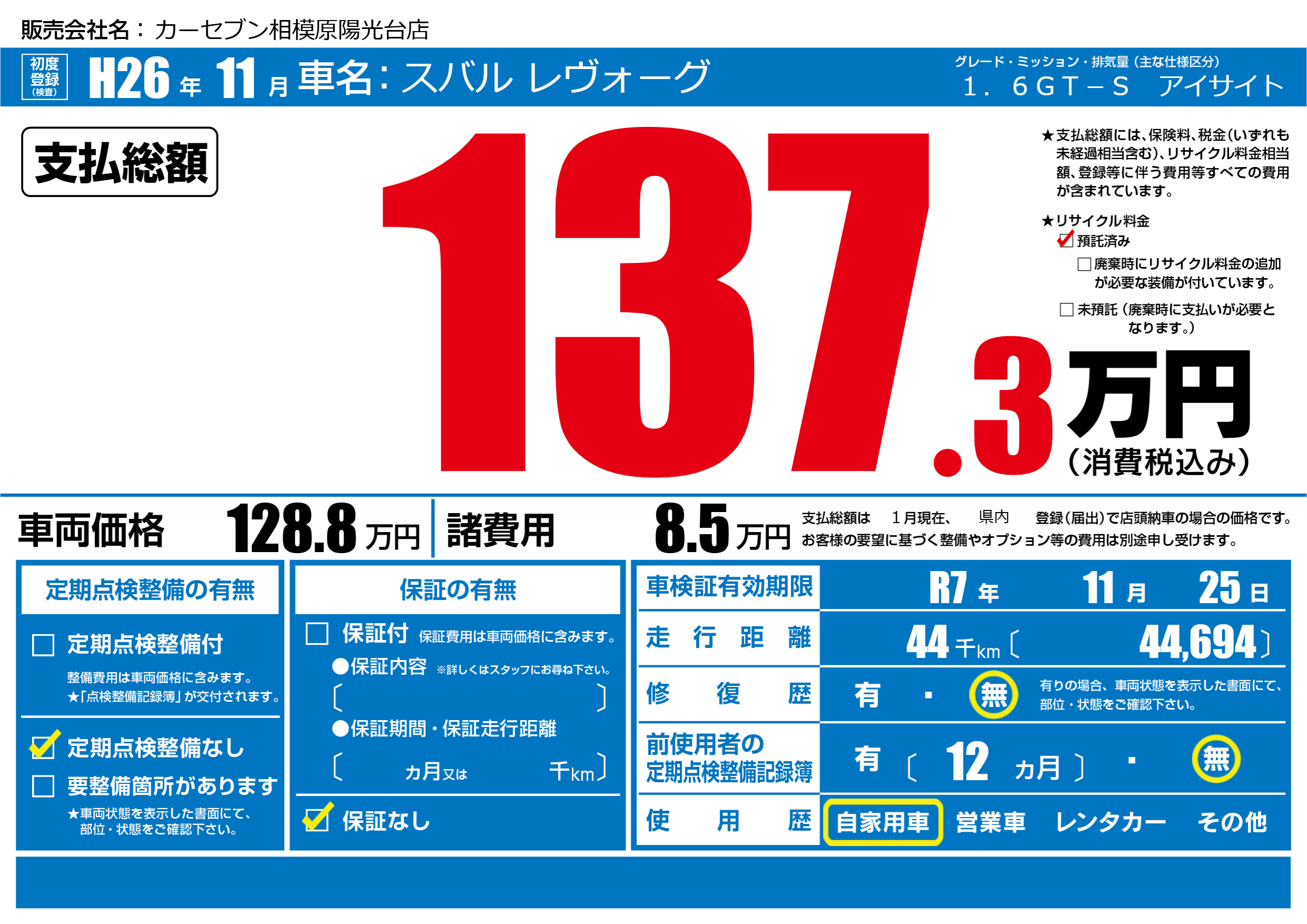 なし | 車検制限 | R7年11月25月 |