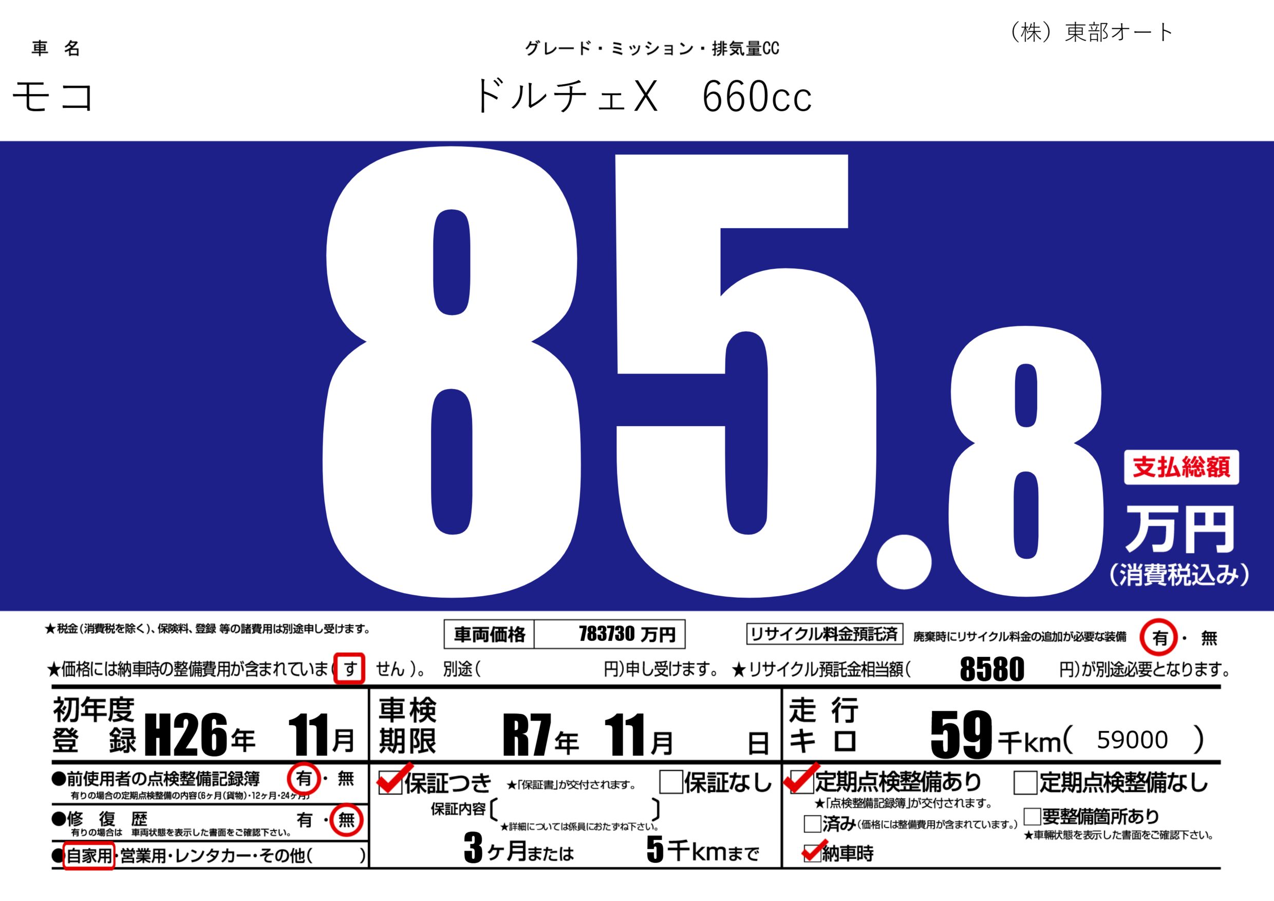 保証付き 保証内容(---) 3ヶ月または(5)千kmまで |