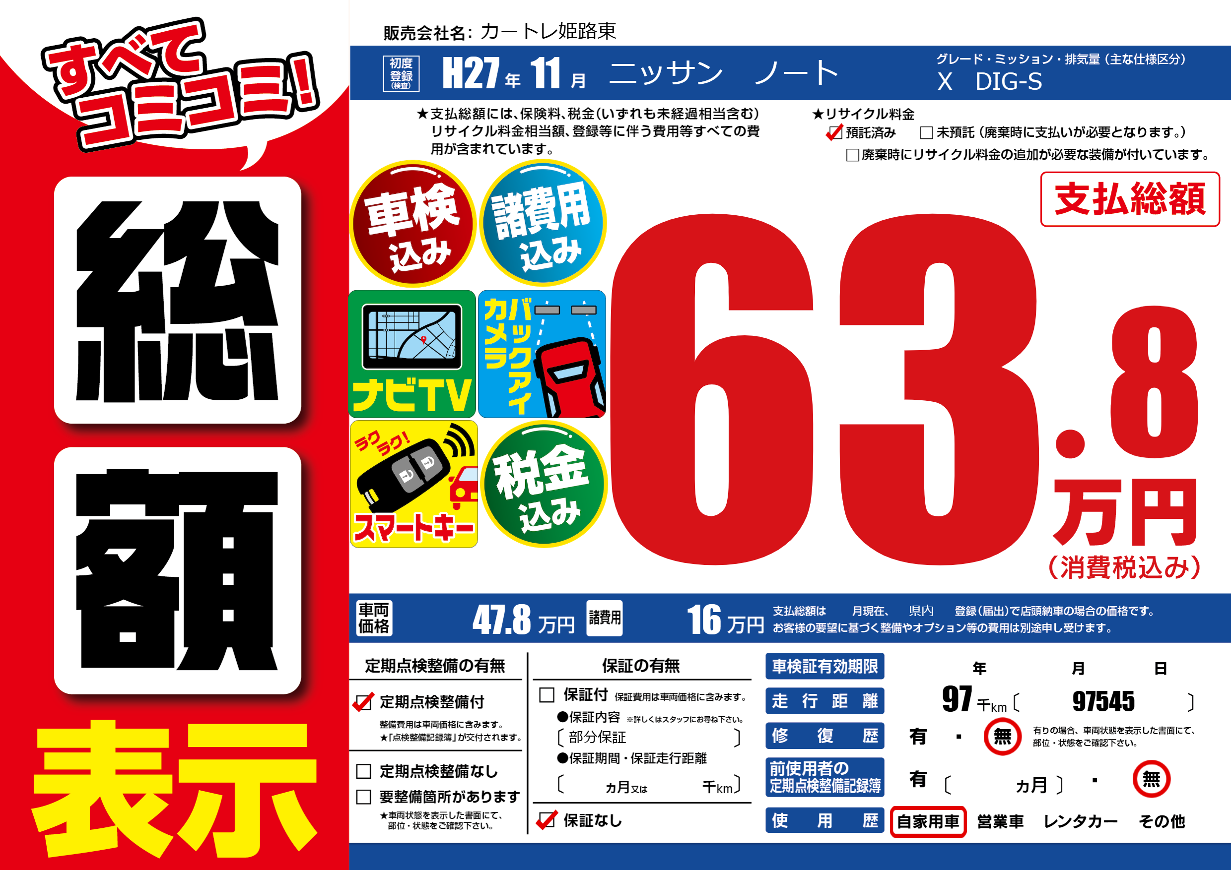 | 走行キロ | 9.7万km | 初年度登録 | H27年11月 |