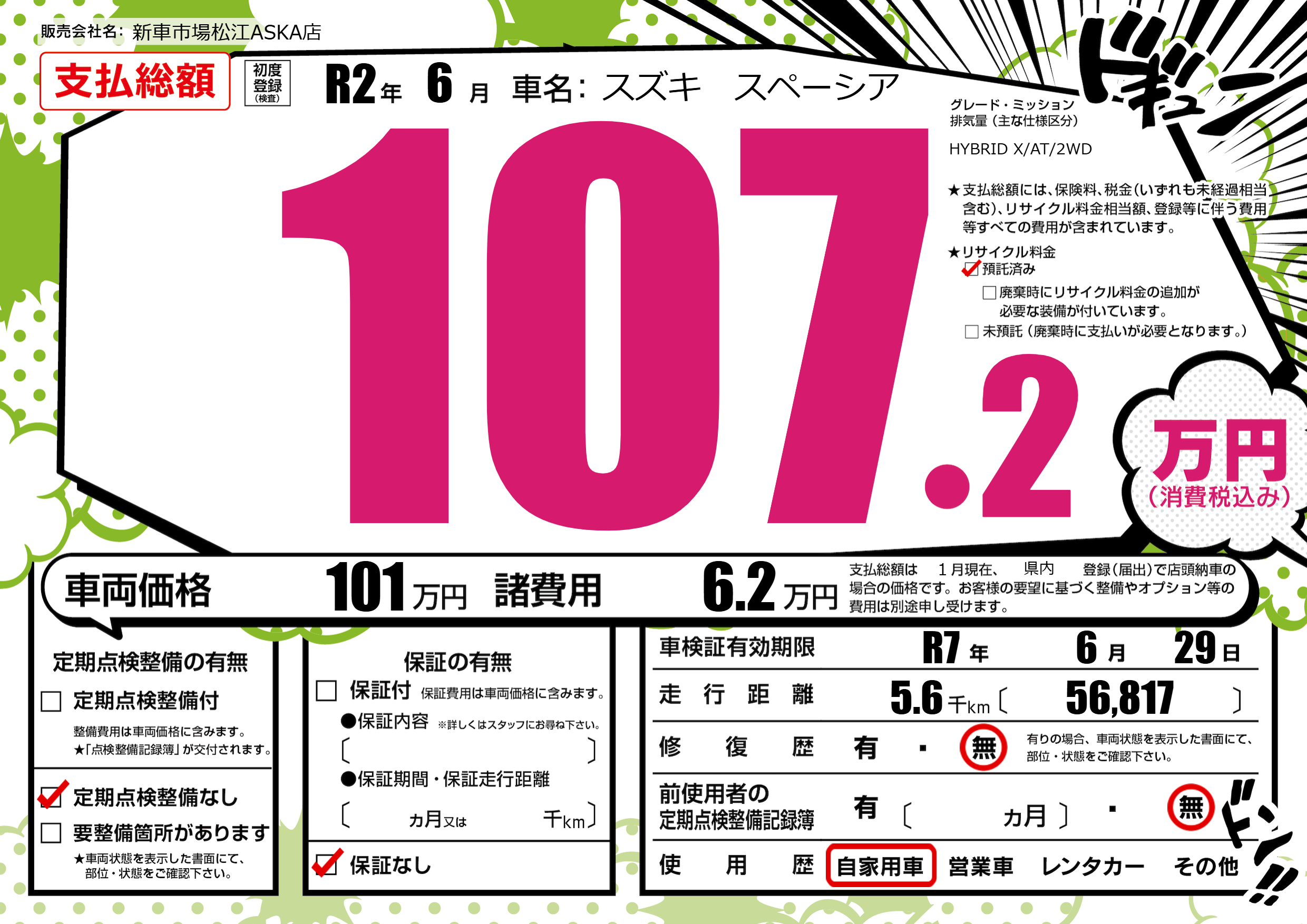 | 車名 | スズキ スペーシア | グレード ミッション 排気量 |