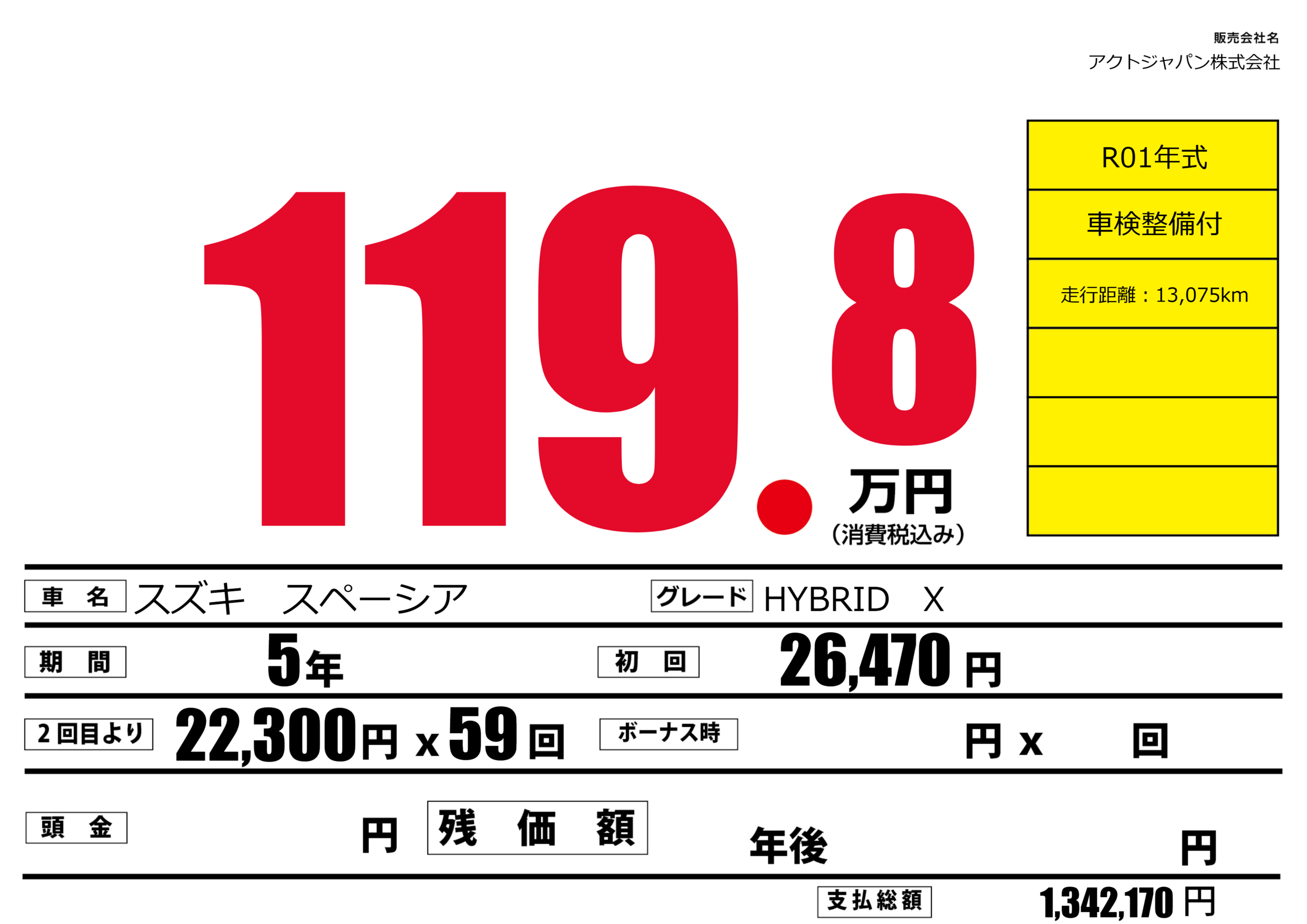 | 車名 | スズキ スペーシア | グレード ミッション 排気量 |