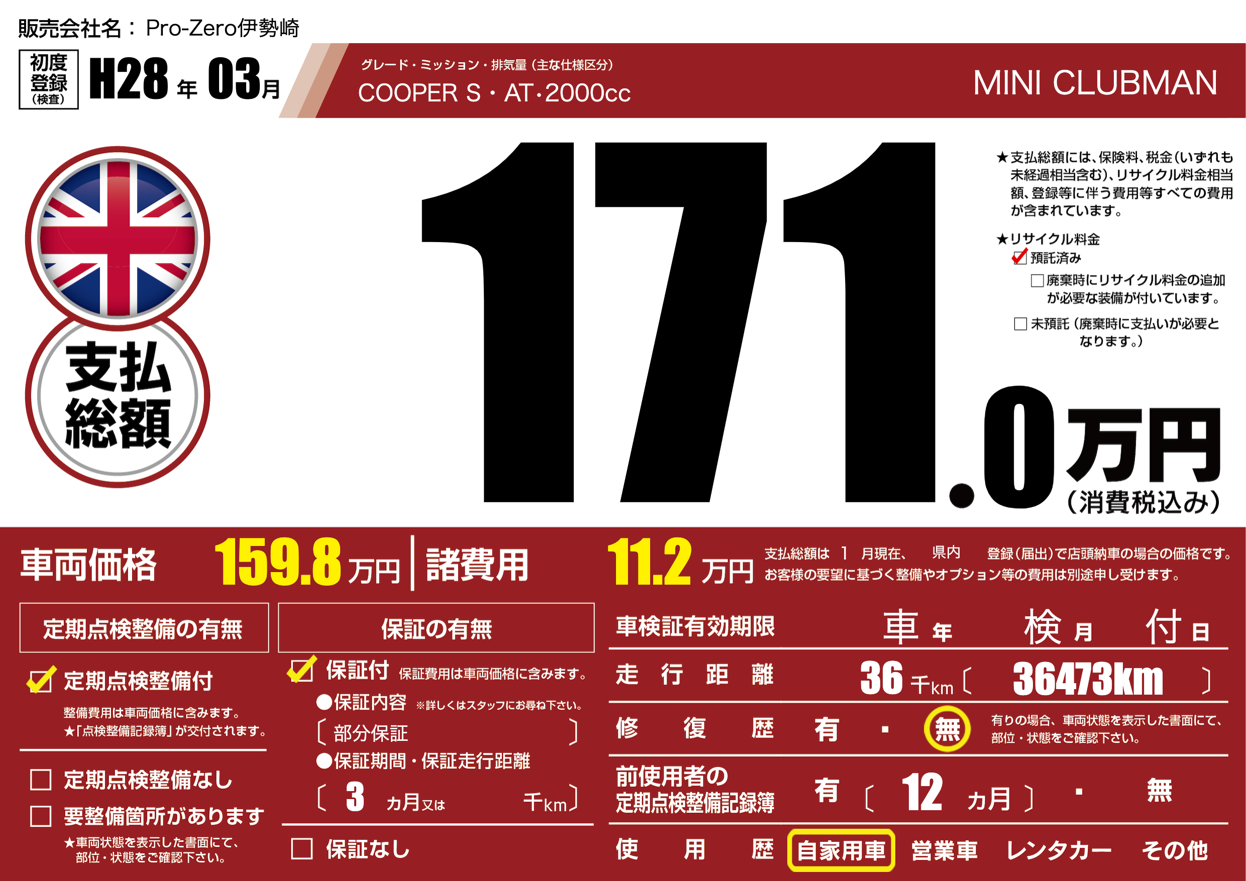 | 車名 | MINI CLUBMAN | グレード ミッション 排気量 |
