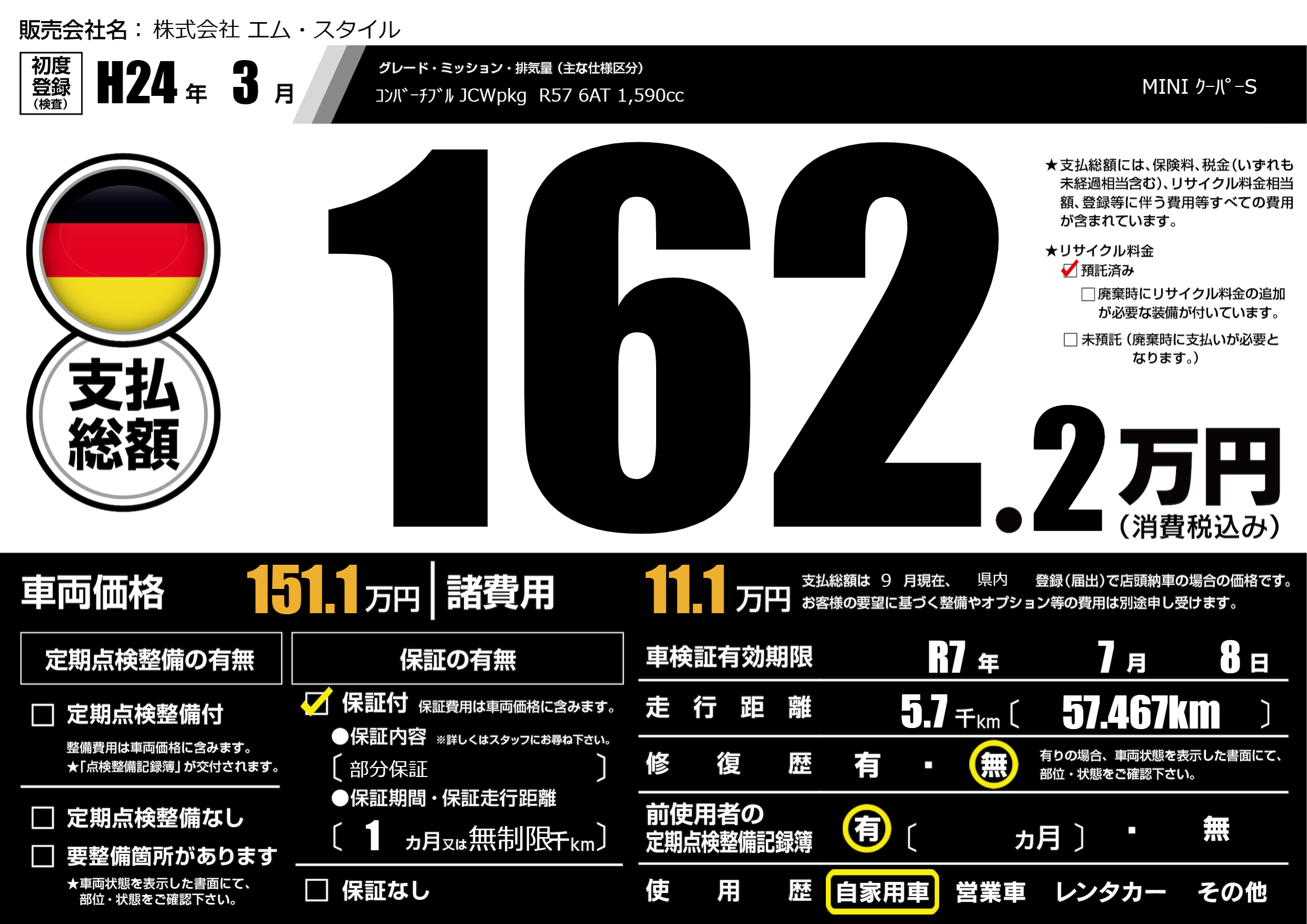 | 車名 | MINI クーパーS | グレード ミッション 排気量 |