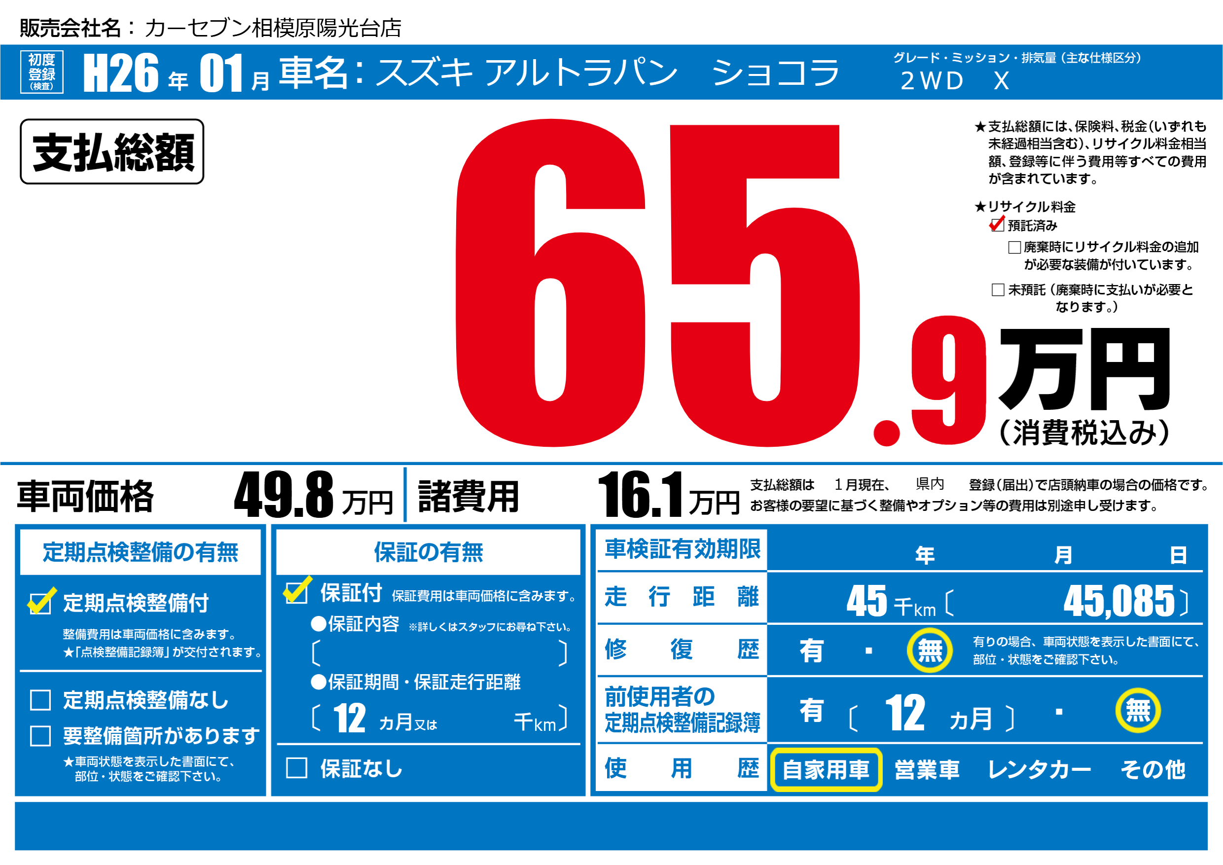 | 走行キロ | 4.5万km | 初年度登録 | H26年01月 |