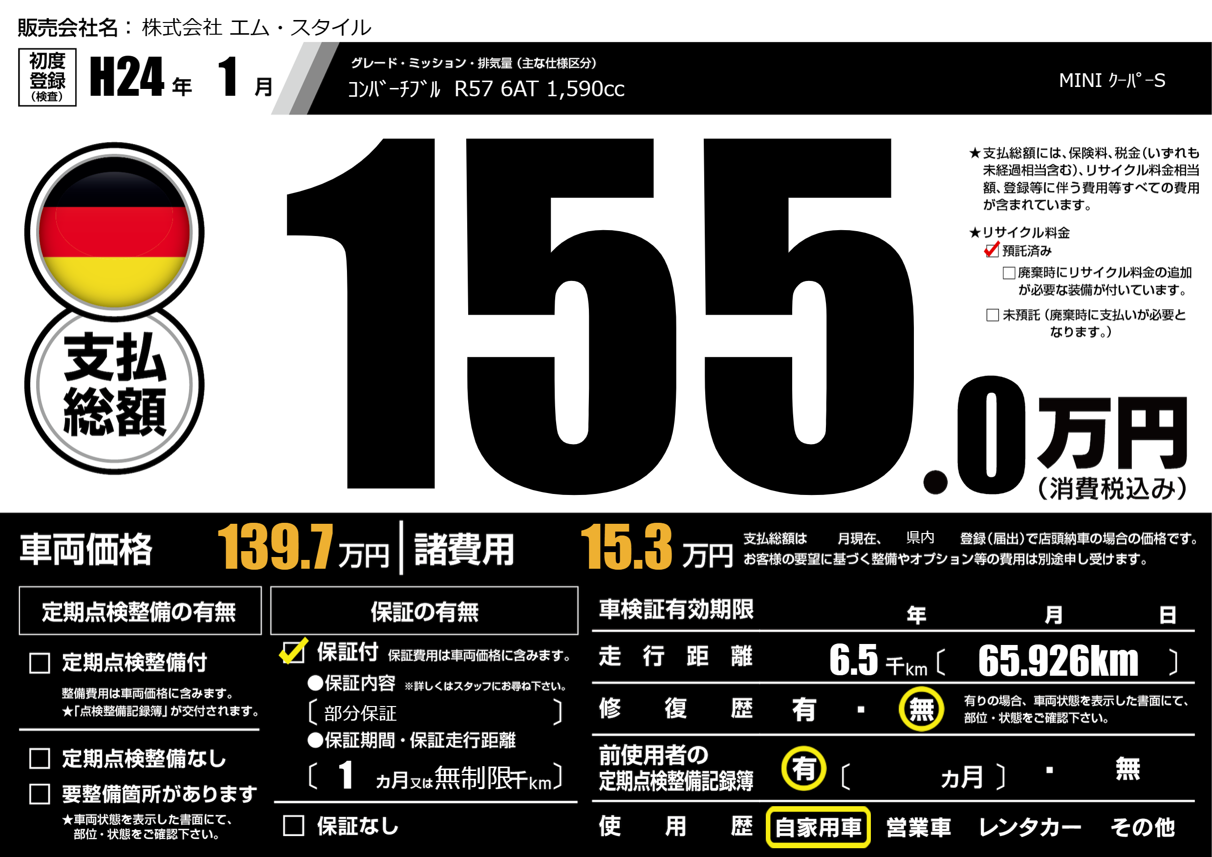 | 車名 | MINI クーパーS | グレード ミッション 排気量 |