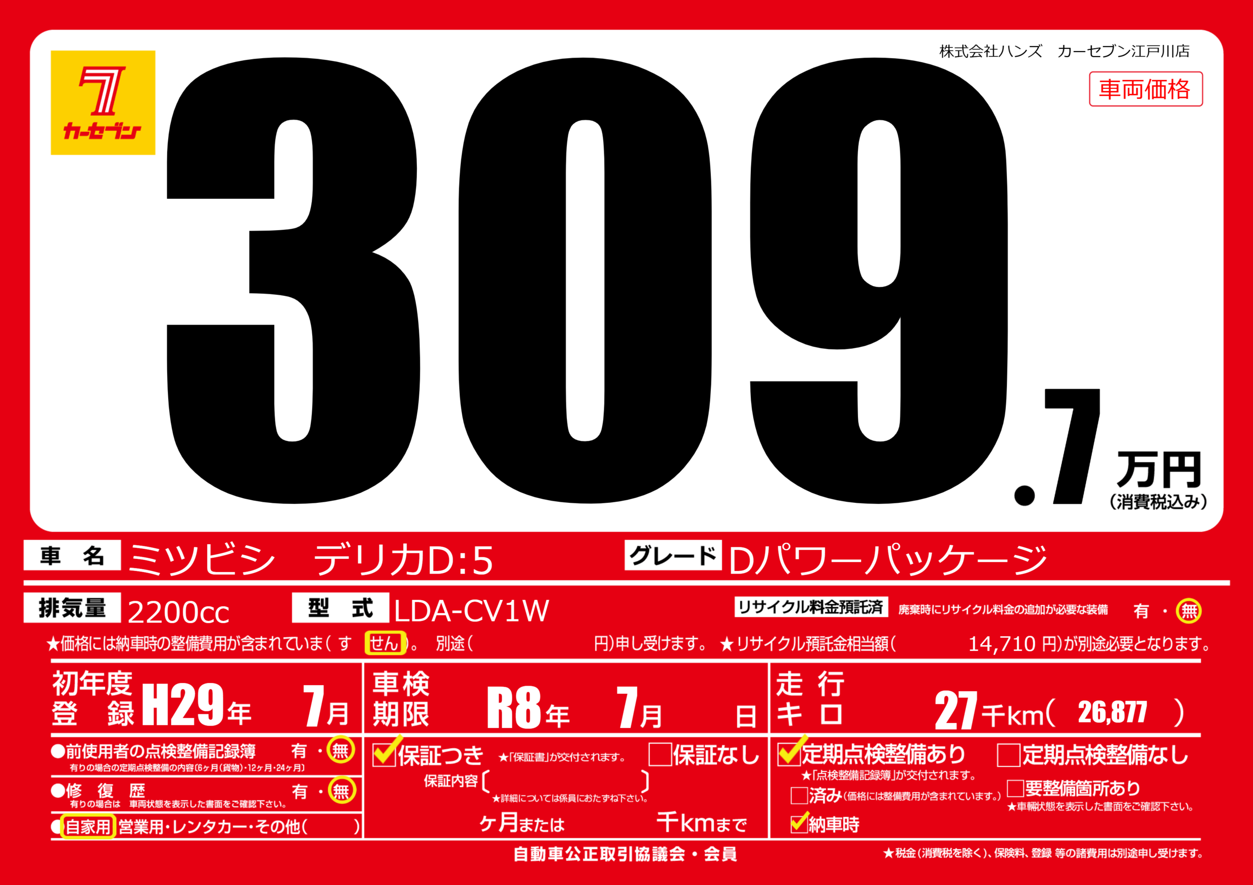| 車名 | ミツビシ デリカD:5 | グレード ミッション 排気量 |