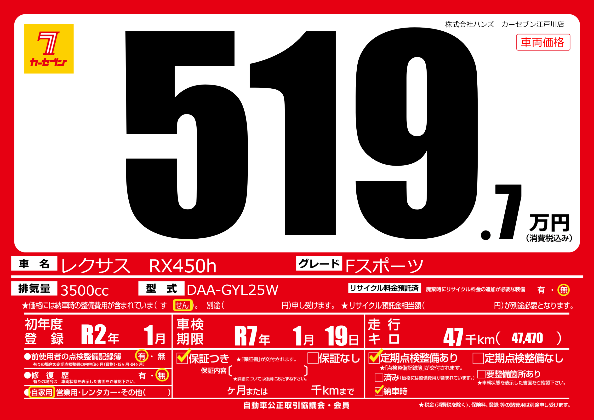 | 車名 | レクサス RX450h | グレード ミッション 排気量 |