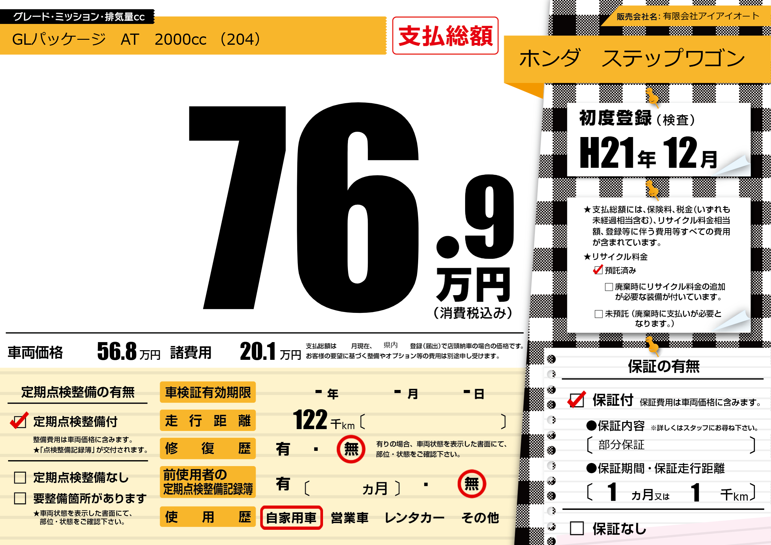 | 車名 | ホンダ ステップワゴン | グレード ミッション 排気量 |