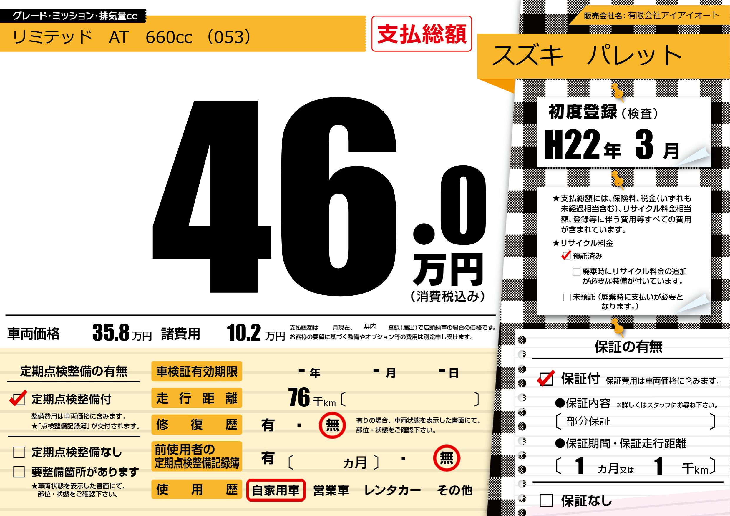 | 車名 | スズキ パレット | グレード ミッション 排気量 |