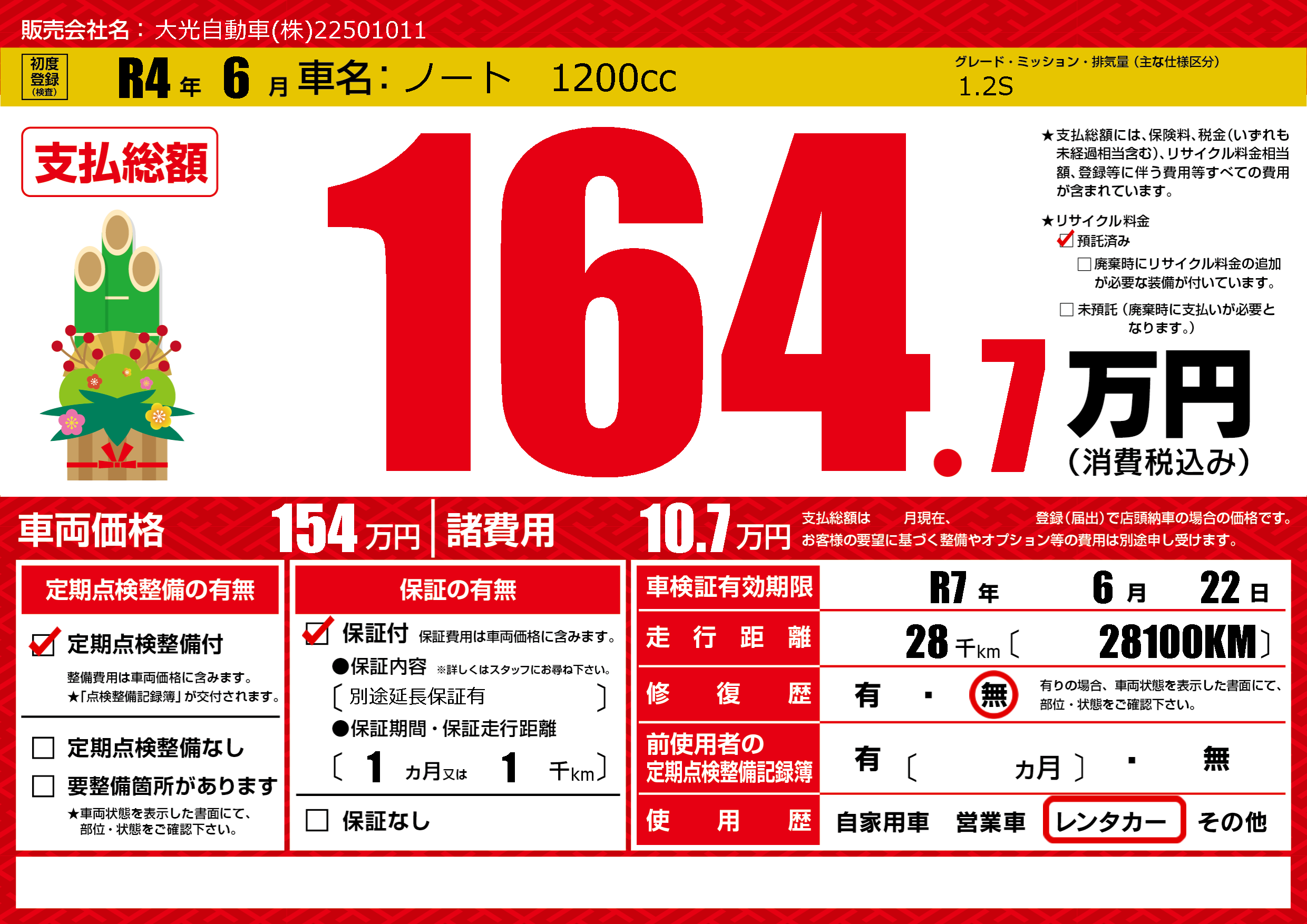 | 車名 | ノート 1200cc | グレード ミッション 排気量 |