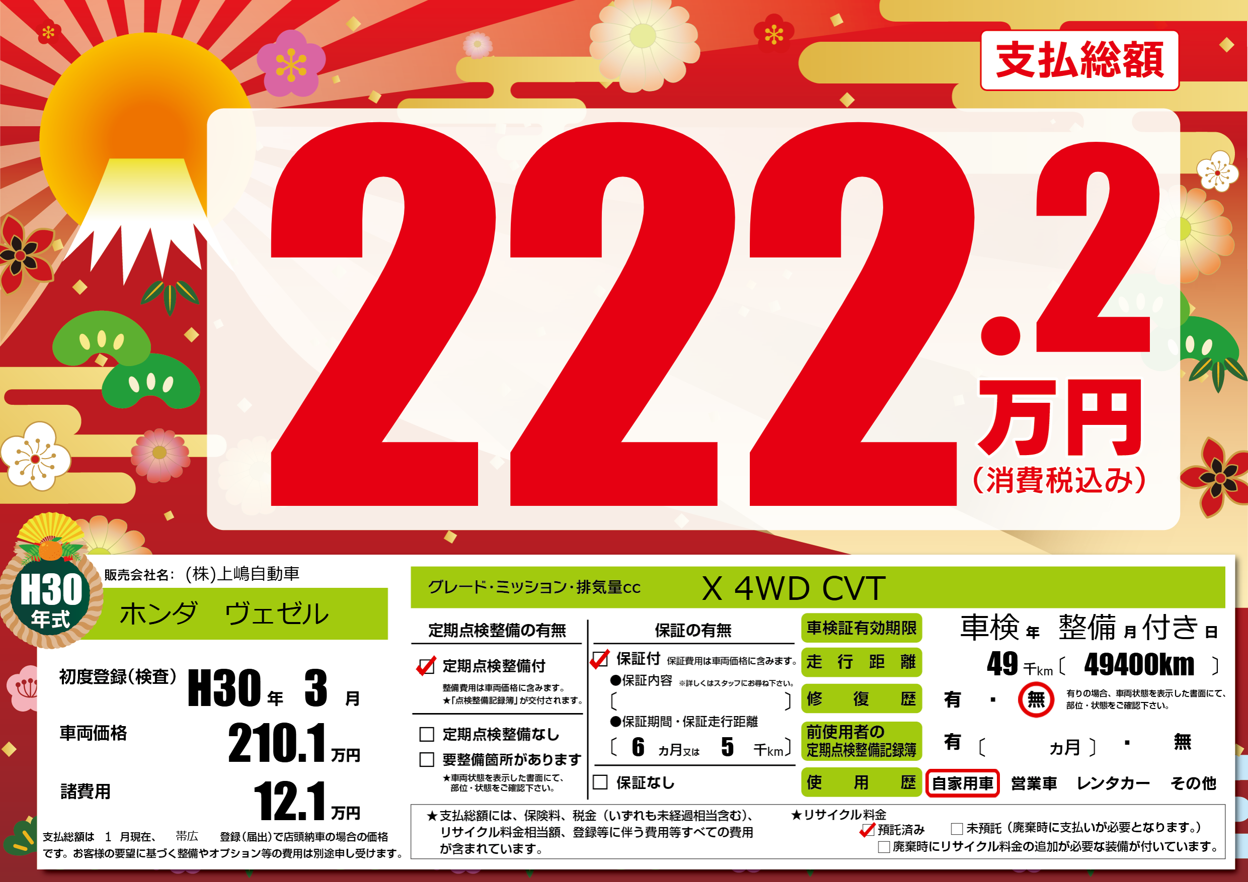 | 走行キロ | 4.9万km | 初年度登録 | H30年3月 |