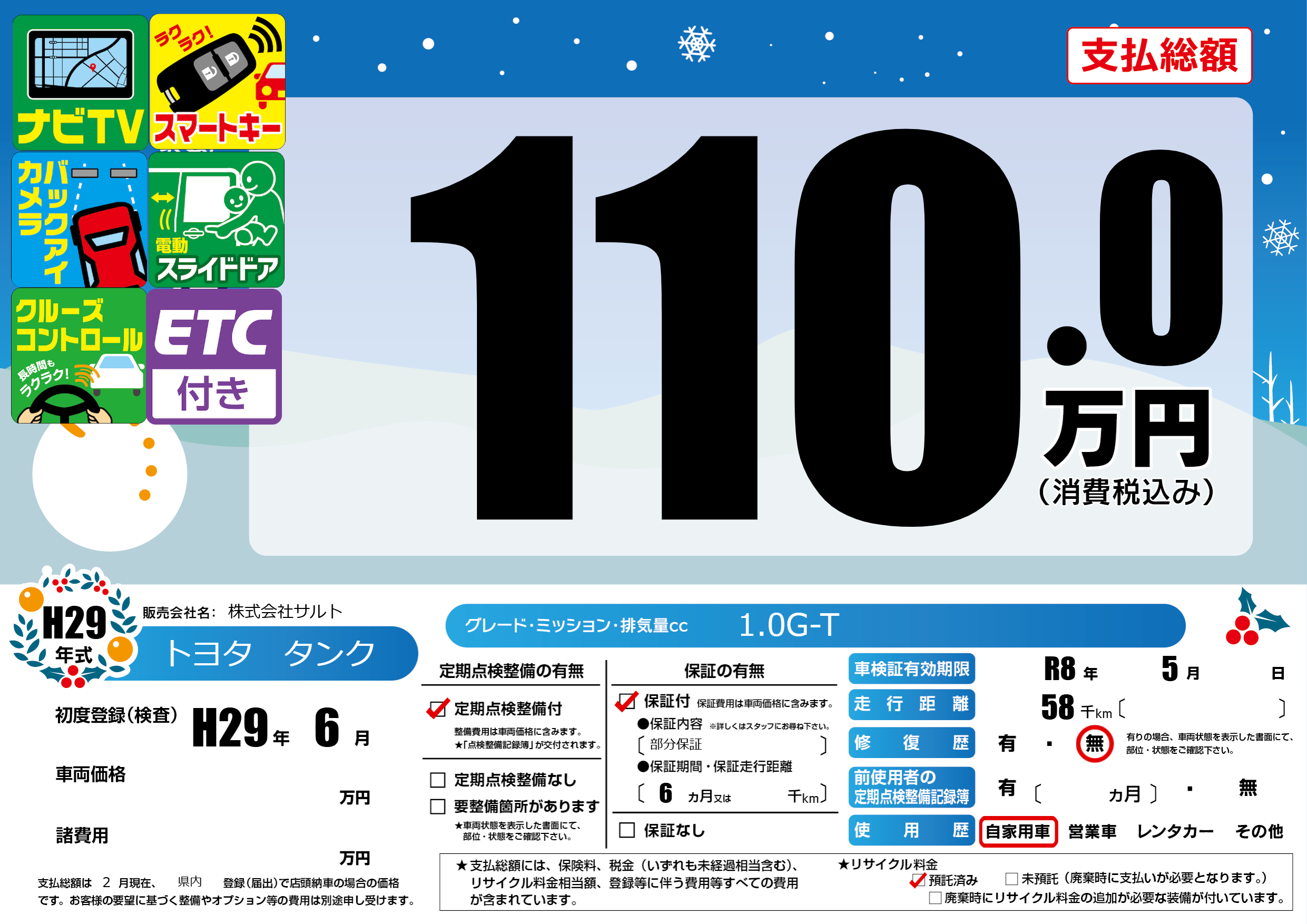 | 車名 | トヨタ タンク | グレード ミッション 排気量 |