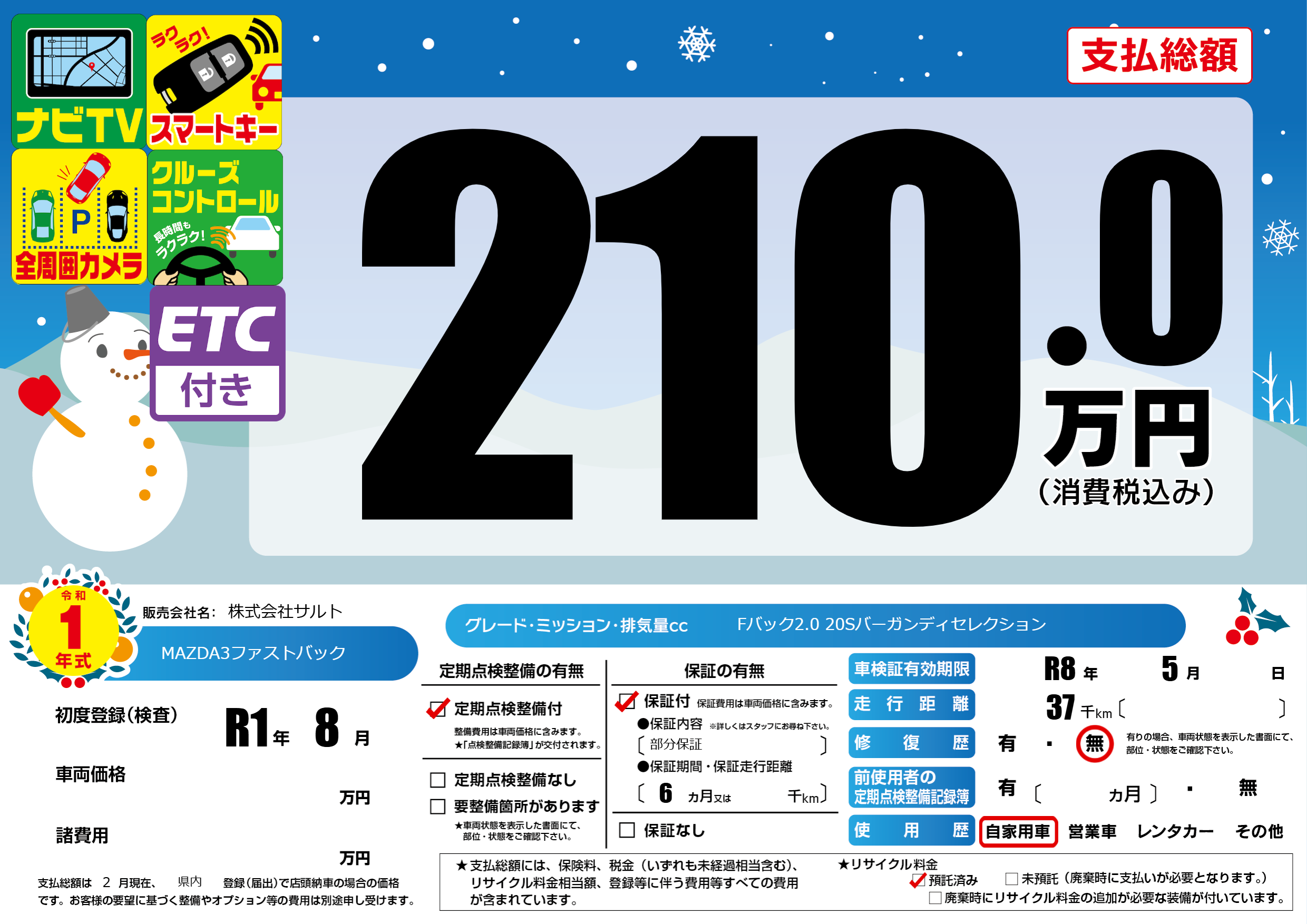 | 走行キロ | 3.7万km | 初年度登録 | R1年8月 |