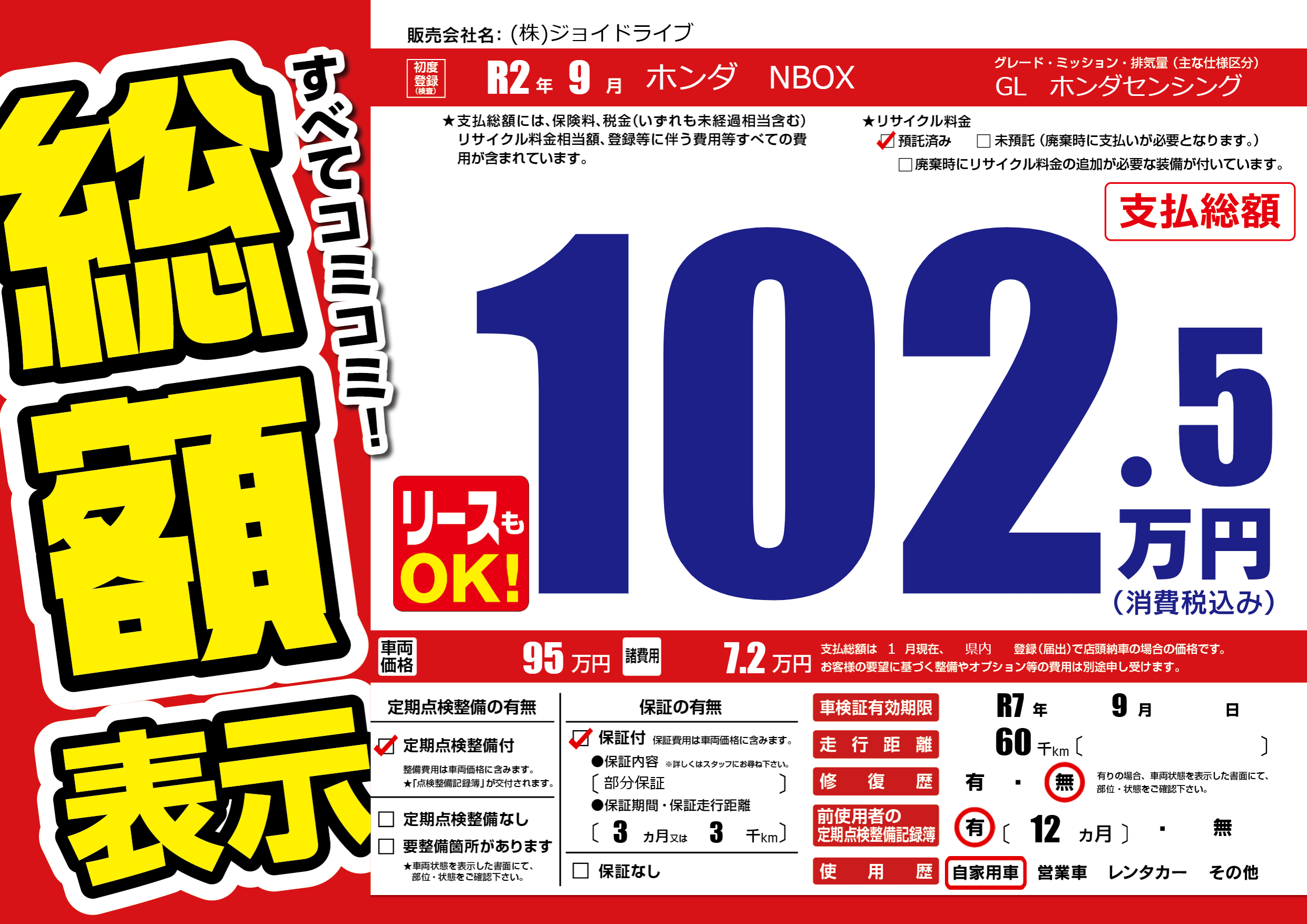 | 走行キロ | 6万km | 初年度登録 | R2年9月 |