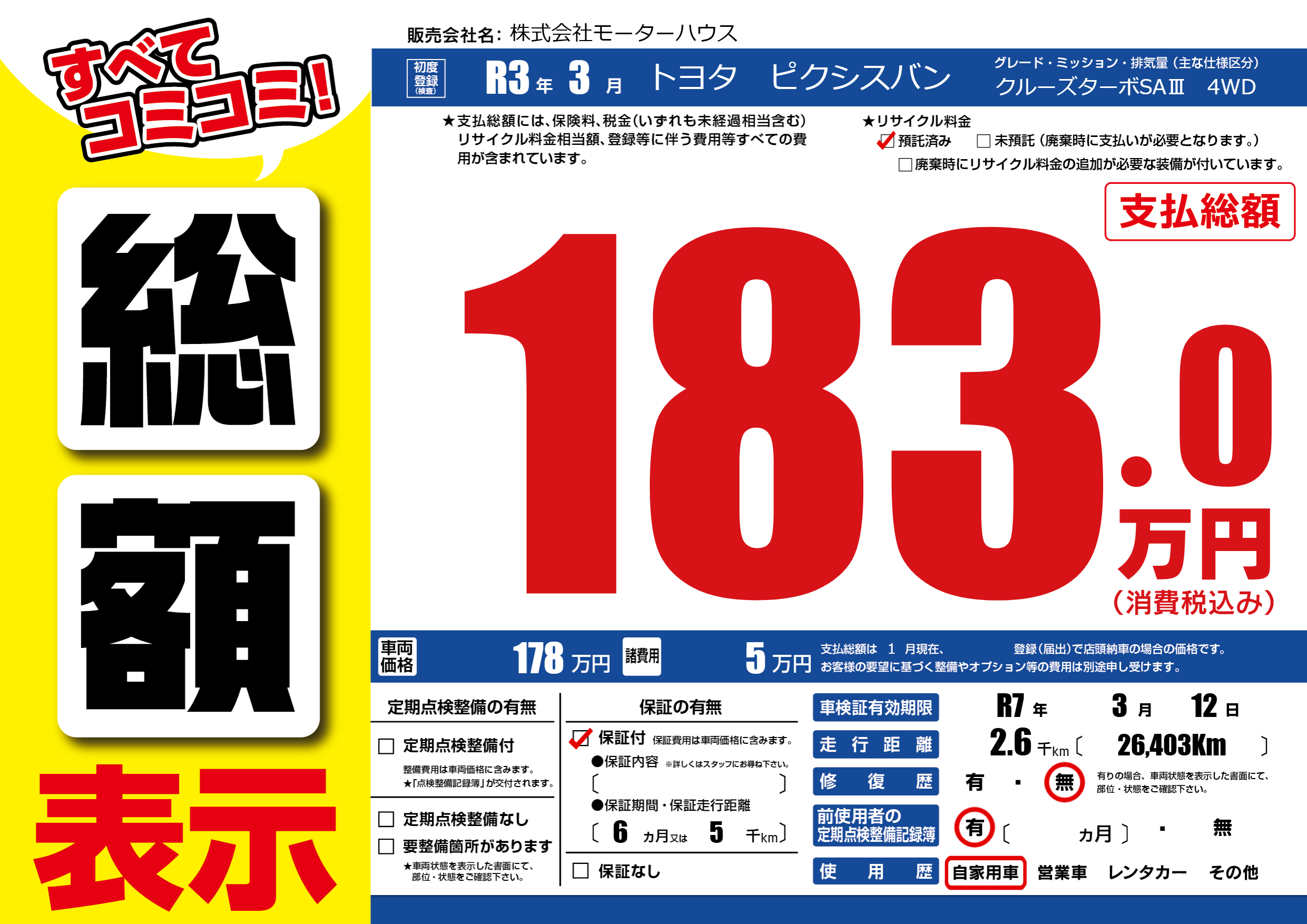 | 走行キロ | 0.2万km | 初年度登録 | R3年3月 |