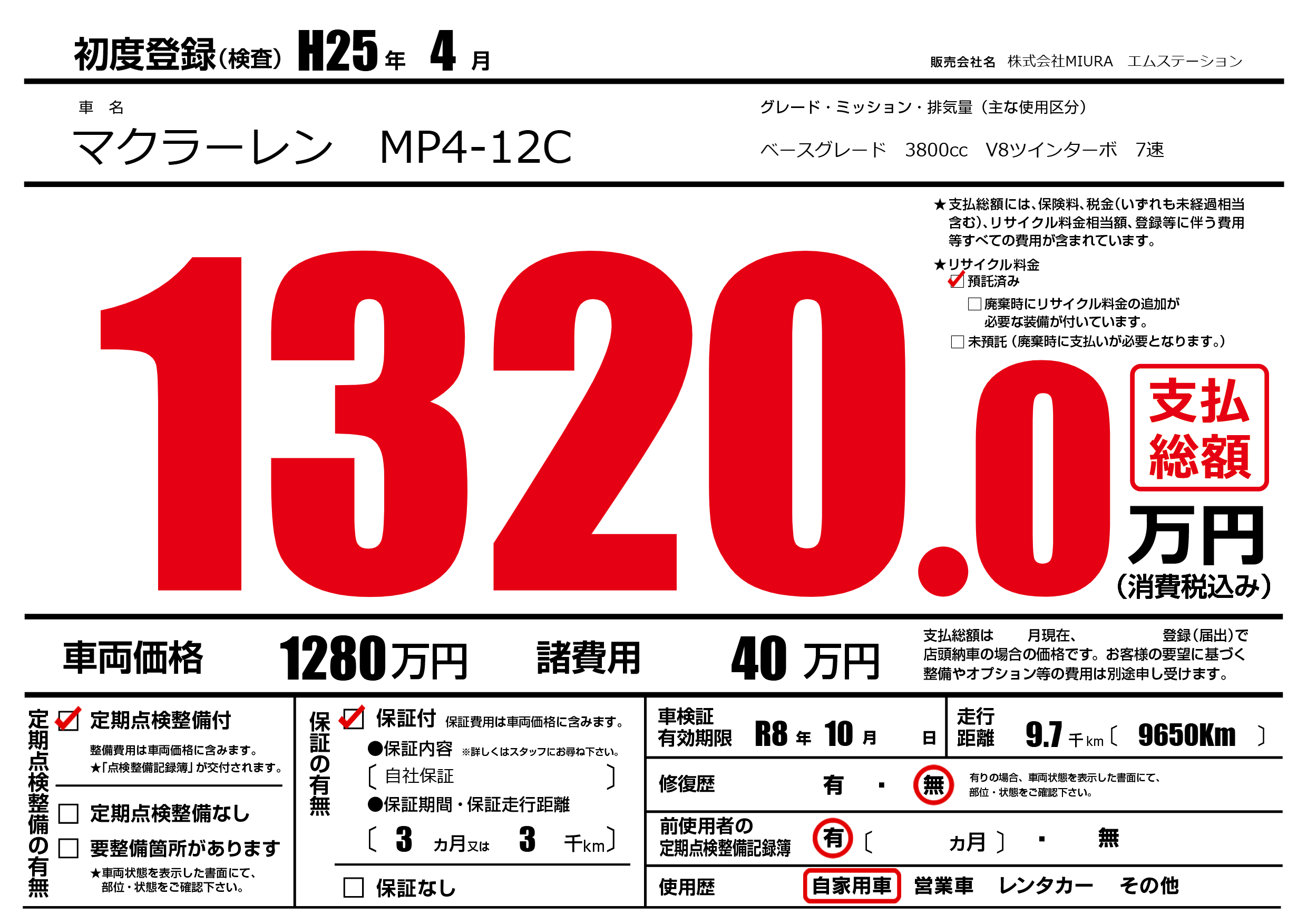 | 車名 | マクラーレン MP4-12C | グレード ミッション 排気量 |